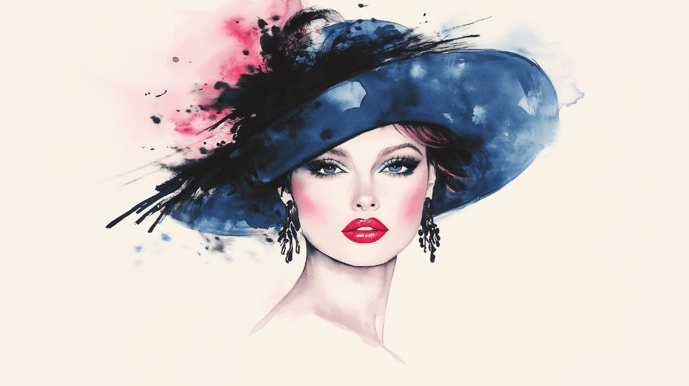 Diese Modekunst-Tapete fängt die Essenz der Haute Couture durch ein eindrucksvolles Aquarellporträt ein. Die Komposition konzentriert sich auf ein elegantes Design mit einem dramatischen blauen breitkrempigen Hut mit dynamischen schwarzen Spritzern und subtilen rosa Untertönen. Die kräftig roten Lippen und zarten Gesichtszüge schaffen einen meisterhaften Kontrast zum weichen beigen Hintergrund, während das Aquarellporträt-Wandbild die fließende, künstlerische Natur des Mediums zeigt.