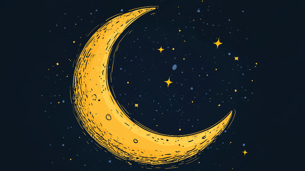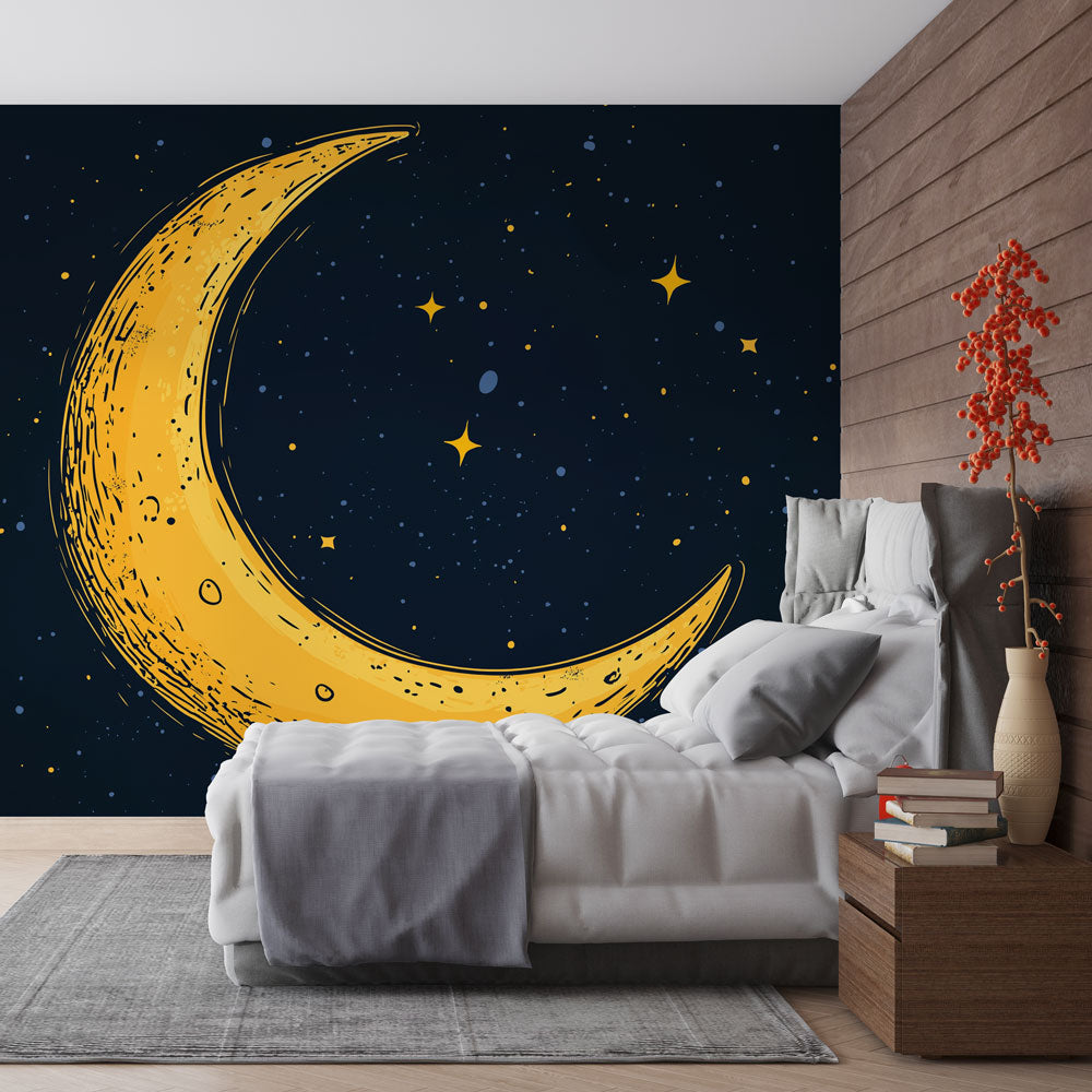 Diese Nachthimmel-Tapete zeigt einen prächtigen goldenen Mondsichel, der im detaillierten handgezeichneten Stil vor einem tiefen marineblauen Hintergrund dargestellt ist. Die strukturierte Oberfläche des Mondes leuchtet in satten Gelbtönen, während verstreute goldene Sterne und subtile blaue Himmelselemente Tiefe im gesamten himmlischen Wandbild-Design schaffen. Die künstlerische Interpretation vermittelt durch ihre kühne Größe und traumhafte Komposition ein Gefühl von Staunen und Verzauberung.