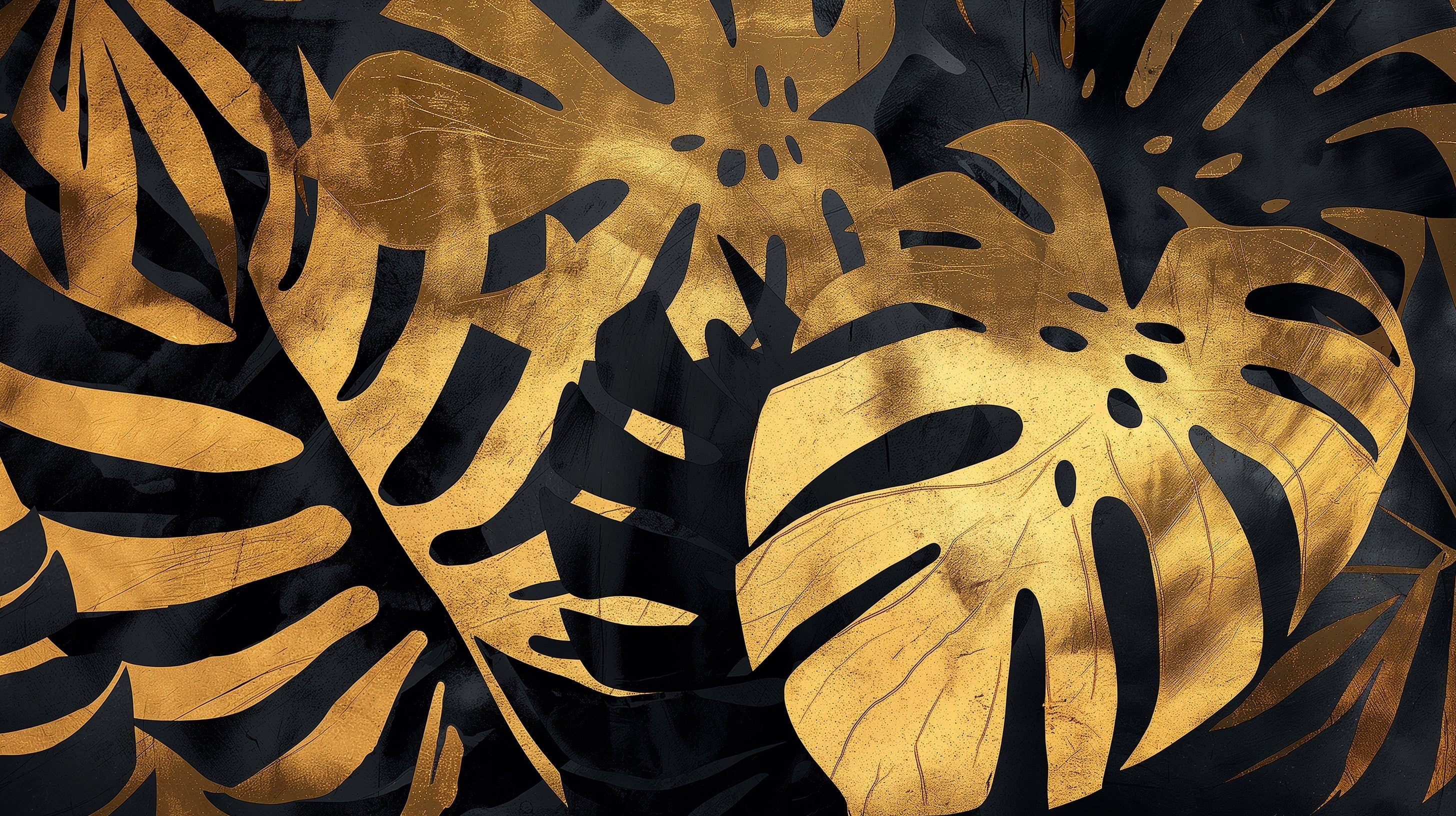Goldene Monstera-Blätter auf schwarzer Wandmalerei