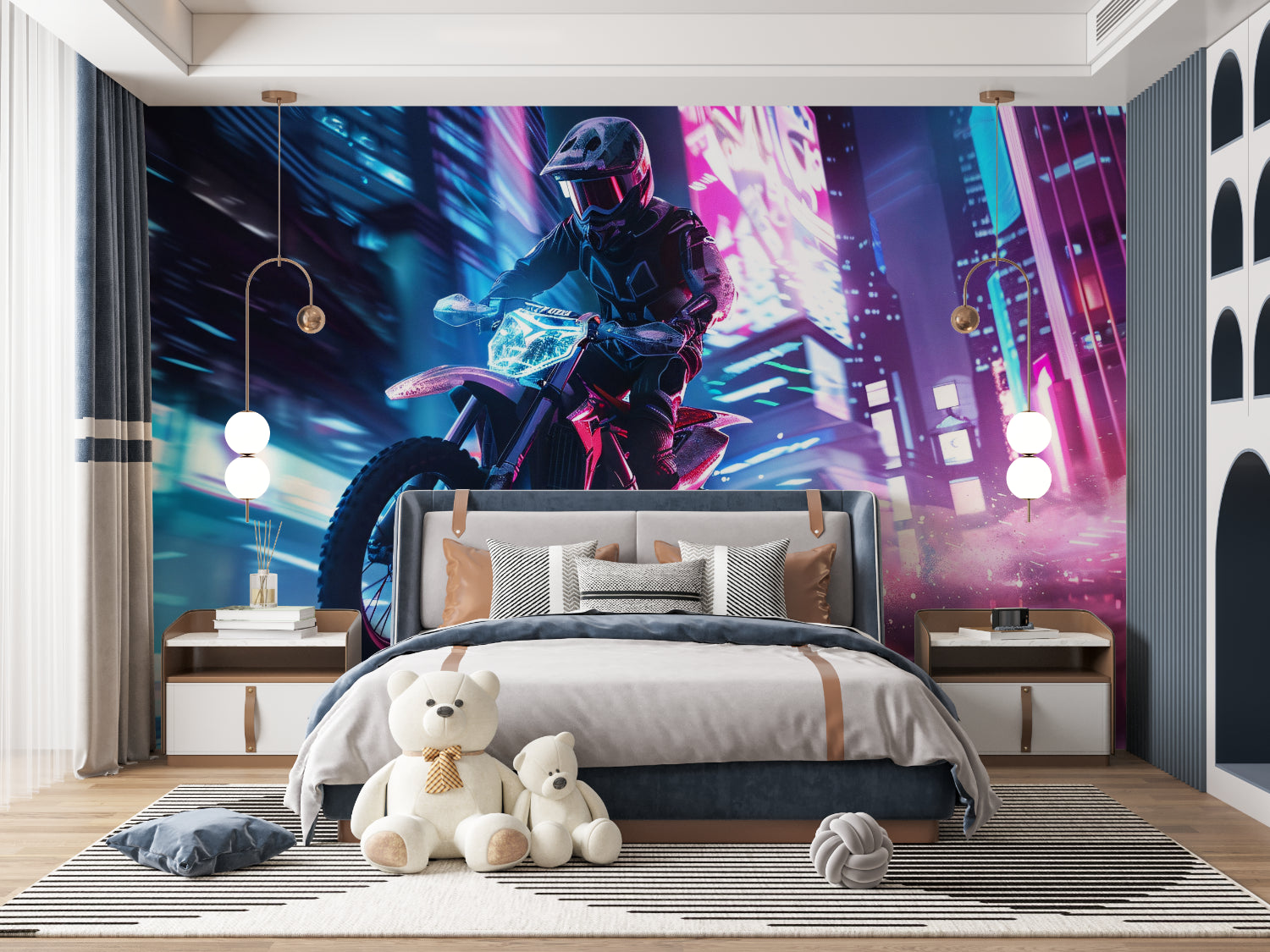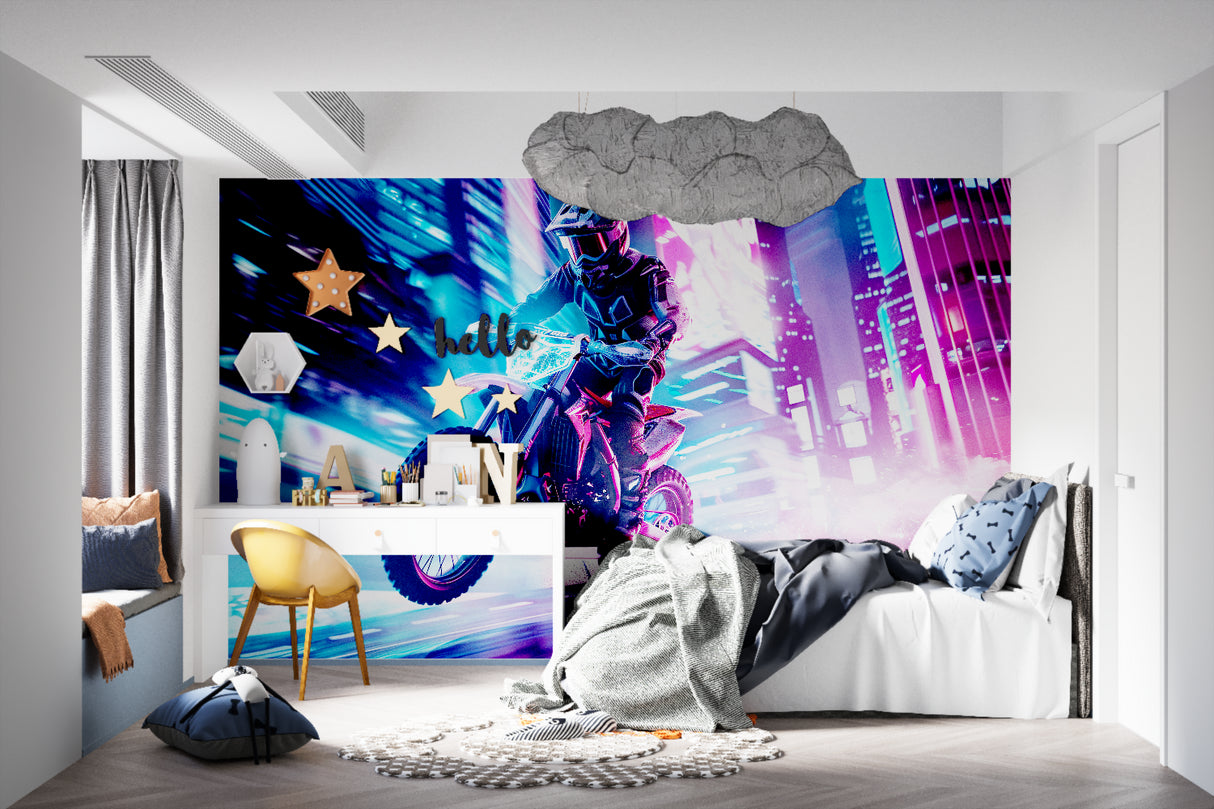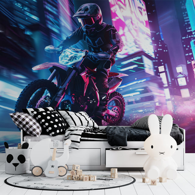 Verwandeln Sie jeden Raum in einen immersiven urbanen Spielplatz mit diesem cyberpunk motorrad mural. Die Verschmelzung von tiefen Purpurtönen, elektrischen Blautönen und brillanten Pinknuancen schafft eine futuristische Atmosphäre, die mit modernen Designempfindungen harmoniert. Diese street racing tapete verleiht Teenager-Schlafzimmern, Gaming-Bereichen oder jedem Raum, der ein mutiges, zeitgenössisches Statement sucht, das den Nervenkitzel des urbanen Motorsports einfängt, eine unverkennbare Kante.