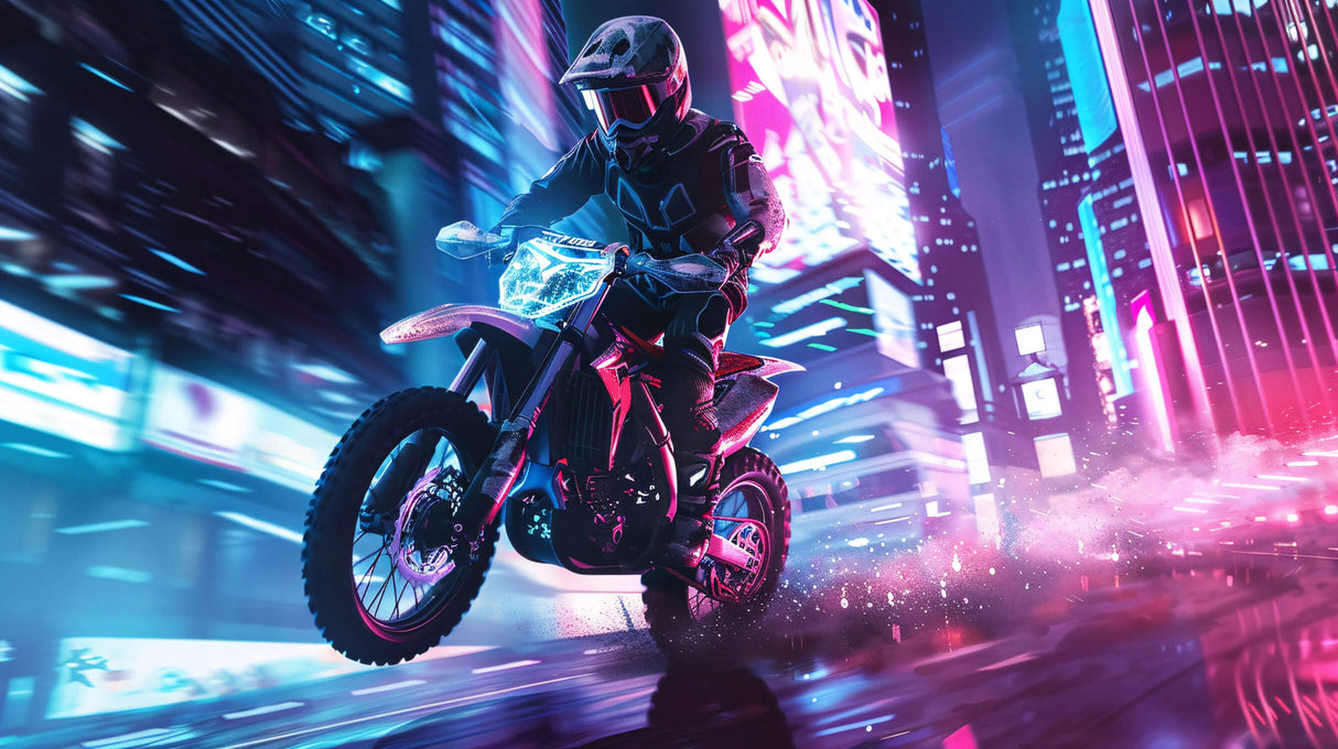 Diese urban motocross tapete fängt die elektrisierende Energie von Nachtrennen durch eine Cyberpunk-Stadtlandschaft ein. Die dynamische Komposition zeigt einen kraftvollen Motorradfahrer vor einer Kulisse aus neonbeleuchteten Wolkenkratzern und schafft eine eindrucksvolle visuelle Erzählung in satten Blau- und Magentatönen. Die neon motorrad tapete verbindet meisterhaft Bewegungsunschärfeffekte mit lebendiger LED-Beleuchtung und erzeugt eine intensive Atmosphäre von Geschwindigkeit und urbanem Abenteuer.