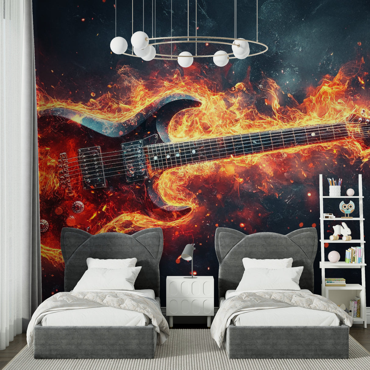 Verwandeln Sie jeden Raum in eine künstlerische Oase mit dieser Rockmusik Tapete. Ob im Schlafzimmer eines Teenagers, Musikzimmer oder Kreativstudio – dieses dramatische Musik Wanddesign setzt einen elektrisierenden Blickfang, der Inspiration entfacht. Der kraftvolle Kontrast zwischen der feurigen Gitarre und dem kühlen dunklen Hintergrund schafft Tiefe und Dimension und macht es zur idealen Wahl für alle, die ihre Liebe zur Musik durch Inneneinrichtung ausdrücken möchten.