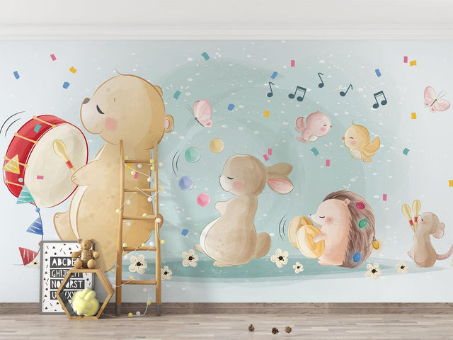 Musikalische Tiere Tapete | Verspielte Kinderzimmer-Band mit Bär und Hase