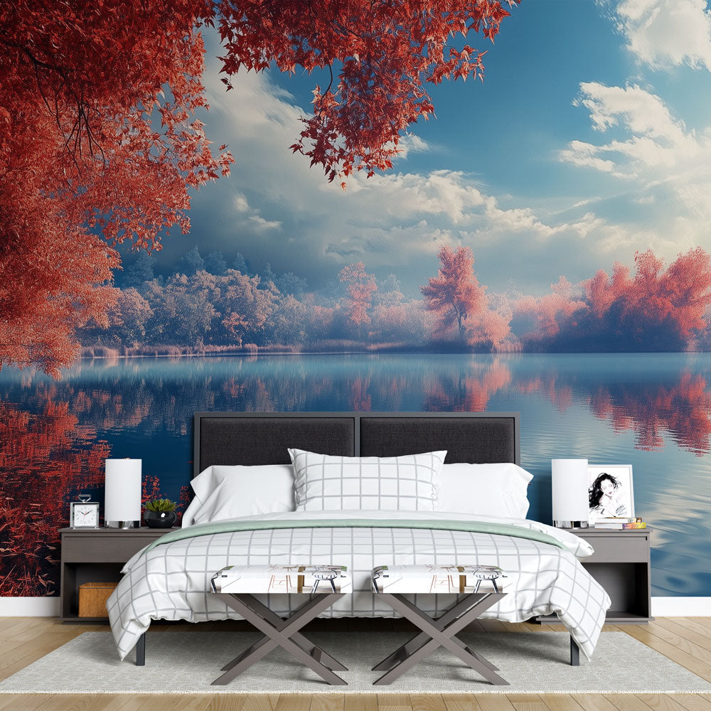 Verwandeln Sie Ihren Raum mit dieser Tapete mit Herbstlandschaft, die die Ruhe der Natur ins Innere bringt. Das Landschaftsmural schafft ein intensives Erlebnis und erweitert die wahrgenommenen Dimensionen jedes Raumes durch seine reflektierten Bilder. Die harmonische Mischung aus tiefem Blau und warmem Rot etabliert eine anspruchsvolle Farbpalette, die sich wunderschön an verschiedene Einrichtungsstile anpasst, von zeitgenössischen bis zu klassischen Designs.