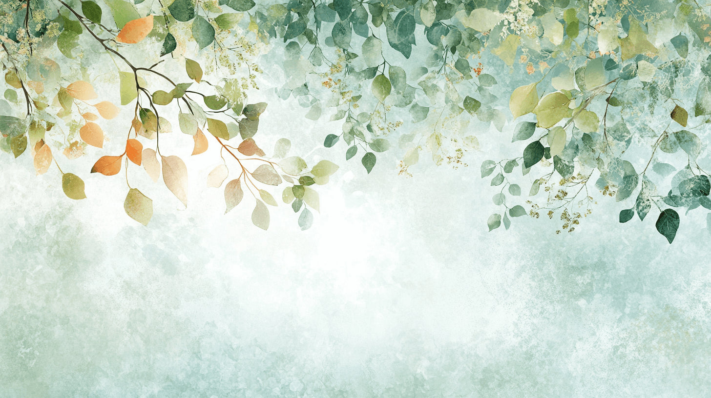 Dieses botanische Wandbild zeigt eine zarte Kaskade von Aquarell-Laub in beruhigenden Salbei- und Minztönen. Die künstlerische Komposition präsentiert anmutig fallende Blätter mit subtilen goldenen Akzenten, die eine ätherische Atmosphäre vor einem weichen, nebligen Hintergrund schaffen. Jedes Blatt ist meisterhaft im naturinspirierten Tapetendesign dargestellt und geht nahtlos von tiefem Smaragdgrün zu sanften Pastelltönen über.
