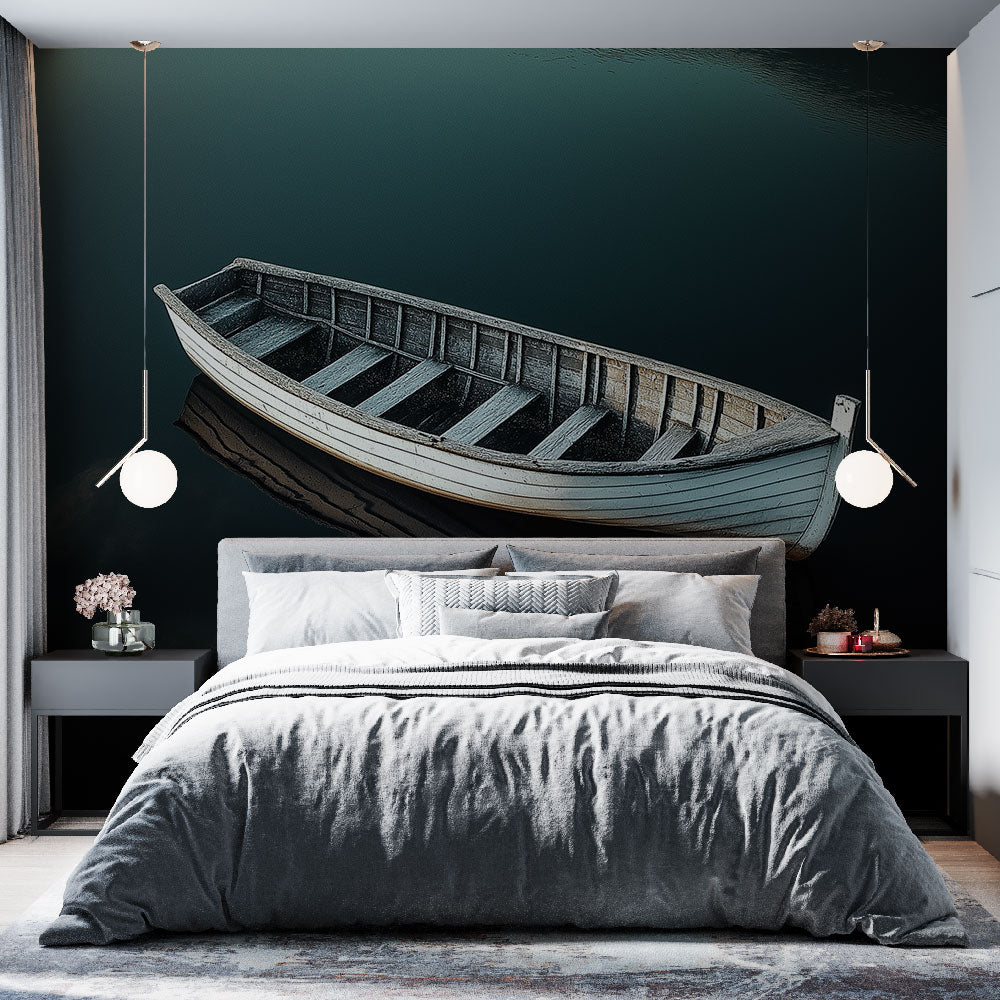 Dieses nautische Wandbild fängt die zeitlose Eleganz eines traditionellen Holzbootes ein, das auf geheimnisvollen tiefgrünen Gewässern schwimmt. Der makellose weiß gestrichene Rumpf bildet einen auffälligen Kontrast zum dunklen, ätherischen Hintergrund, während das sorgfältig detaillierte hölzerne Innenleben Handwerkskunst in jedem Balken und jeder Planke offenbart. Das marine Tapetenmuster zeigt die anmutigen Linien und die symmetrische Struktur des Bootes und schafft einen Blickfang, der das Auge anzieht und die Aufmerksamkeit hält.