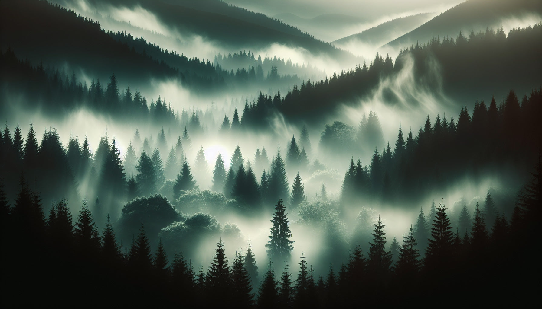 Diese neblige Waldtapete fängt die ätherische Schönheit einer Berglandschaft ein, die im Morgennebel gehüllt ist. Tiefgrüne Tannen ragen majestätisch durch Schichten wirbelnden Nebels und erzeugen einen faszinierenden Tiefeneffekt. Die Bergwaldtapete zeigt das atmosphärische Drama der Natur durch ihre sorgfältig ausbalancierte Komposition aus immergrünen Silhouetten vor weichem, diffusem Licht, das zwischen den Bäumen zu tanzen scheint.
