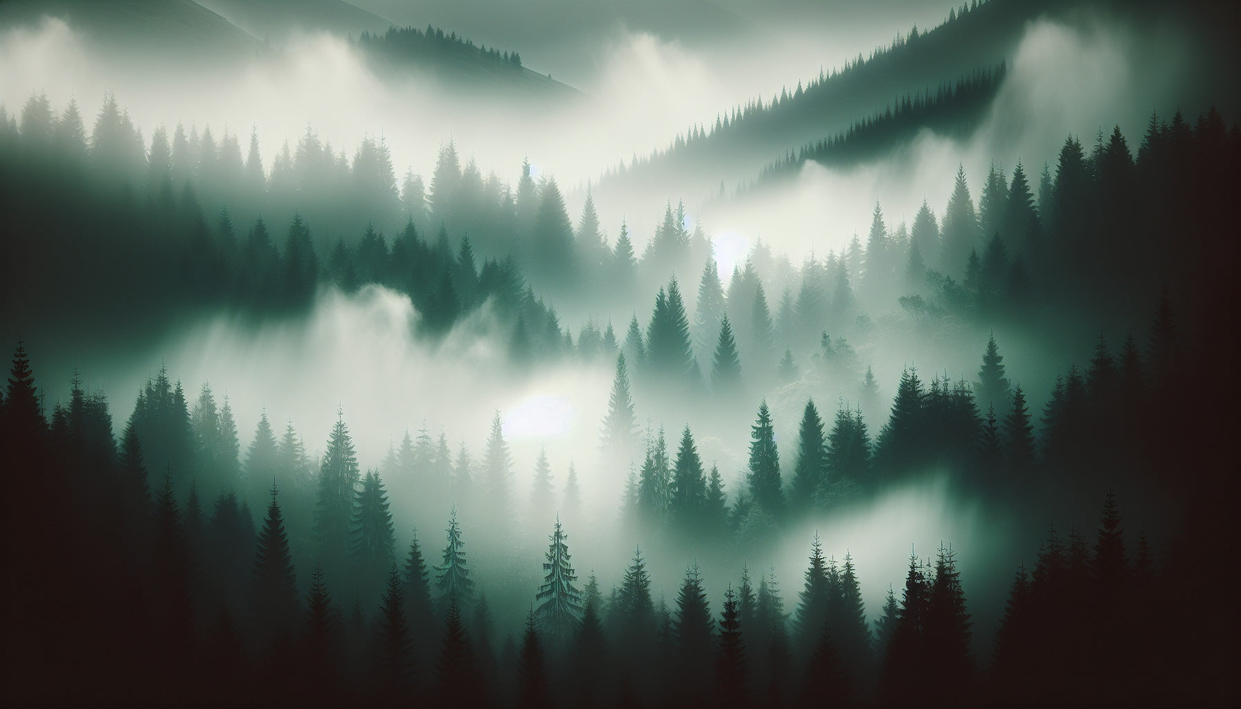 Der sanfte Nebel und die Kiefern schaffen ein Berglandschafts-Mural, das beruhigt und inspiriert.