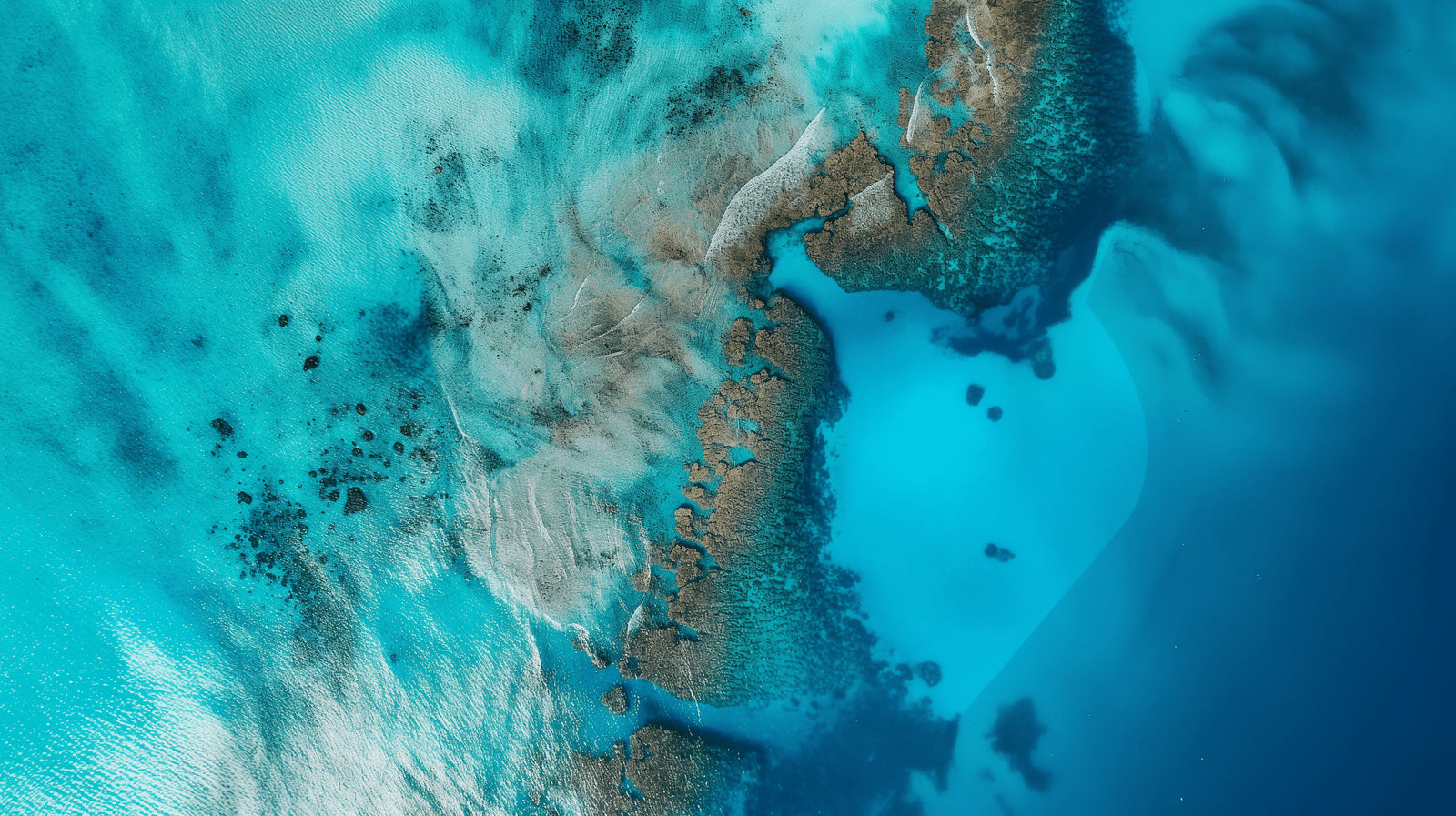Diese luftaufnahme ozean tapete fängt die faszinierende Schönheit eines tropischen Riffs von oben ein, wo kristallklares türkisfarbenes Wasser auf sandige Korallenformationen trifft. Die auffällige Luftperspektive zeigt die Kunstfertigkeit der Natur in feinster Detailgenauigkeit und präsentiert die harmonische Verbindung von tiefem Azurblau mit sandigen Beigetönen. Die tropische riff tapete erzeugt ein fesselndes Farbenspiel, von lebhaftem Türkis bis zu subtilen Erdtönen, und bildet eine organische abstrakte Komposition, die scheinbar endlos fließt.
