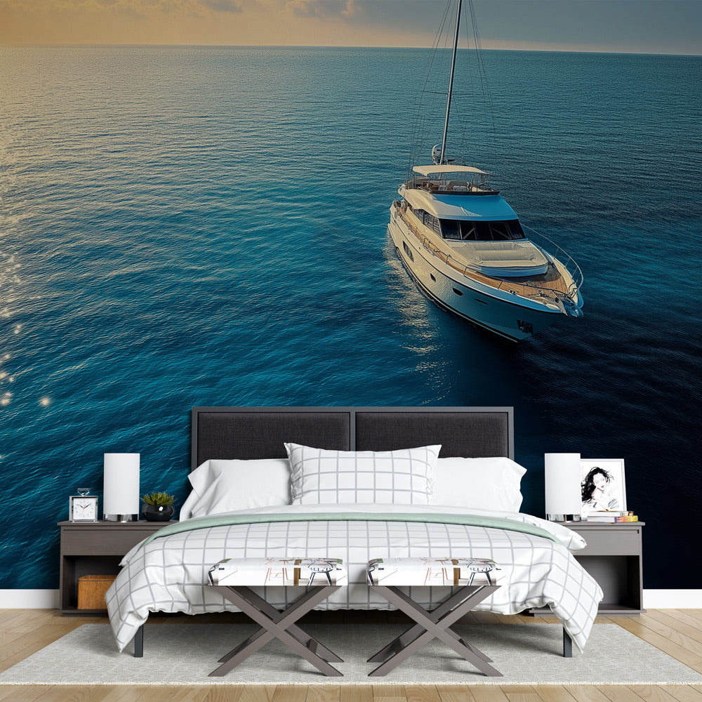 Diese Ozean-Panorama-Tapete fängt einen großartigen Moment ein, in dem türkisfarbenes Wasser auf goldene Himmel trifft. Eine luxuriöse Yacht gleitet durch kristallklares Wasser und schafft eine Komposition von unvergleichlicher Ruhe. Die nautische Wandmalerei zeigt die feinste Farbpalette der Natur, von tiefem Azurblau bis zu warmen Sonnenuntergangstönen, während sanfte Wellen im Wasser das schwindende Tageslicht in einer faszinierenden Darstellung einfangen und reflektieren.
