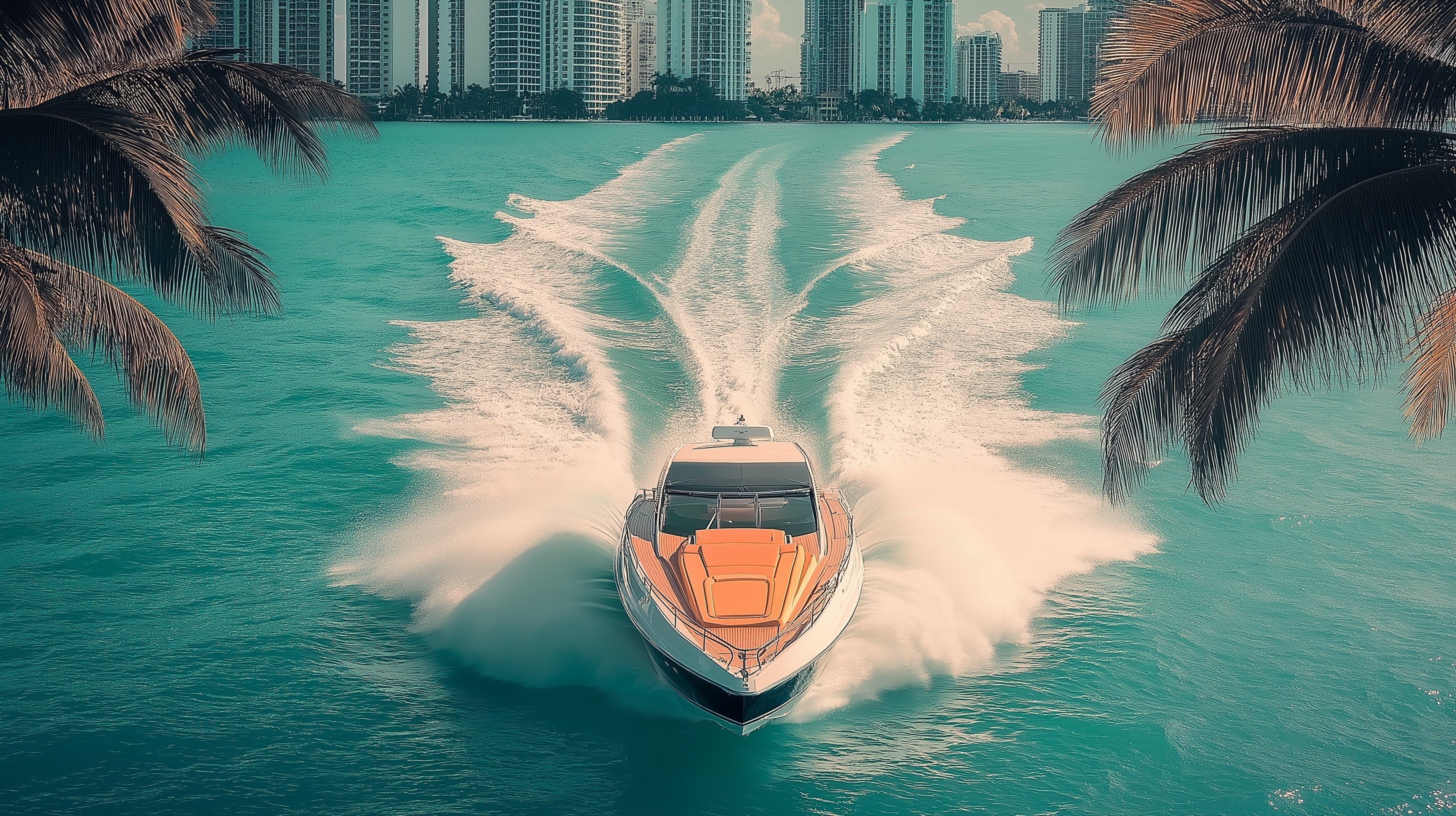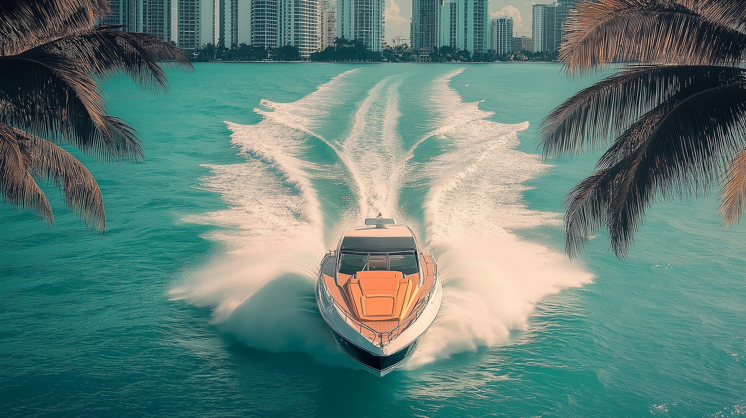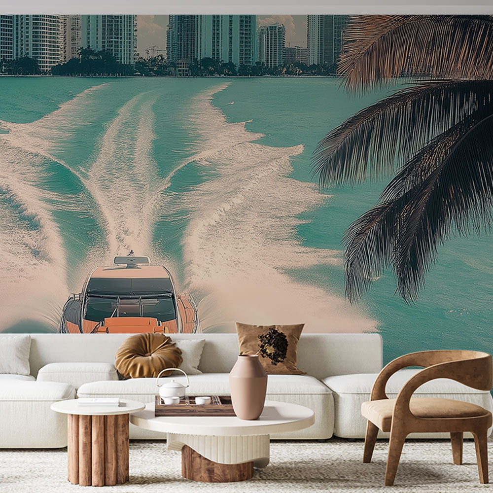 Diese tropische Ozean-Tapete fängt den Nervenkitzel maritimen Luxus vor einer atemberaubenden türkisfarbenen Meereslandschaft ein. Eine elegante Yacht durchschneidet kristallklares Wasser und erzeugt faszinierende weiße Bugwellen, die einen schönen Kontrast zum azurblauen Meer bilden. Umrahmt von sanft wiegenden Palmwedeln und vor dem Hintergrund moderner küstenstädtischer Tapeten-Architektur verbindet dieses Design natürliche Schönheit mit zeitgenössischer Raffinesse.