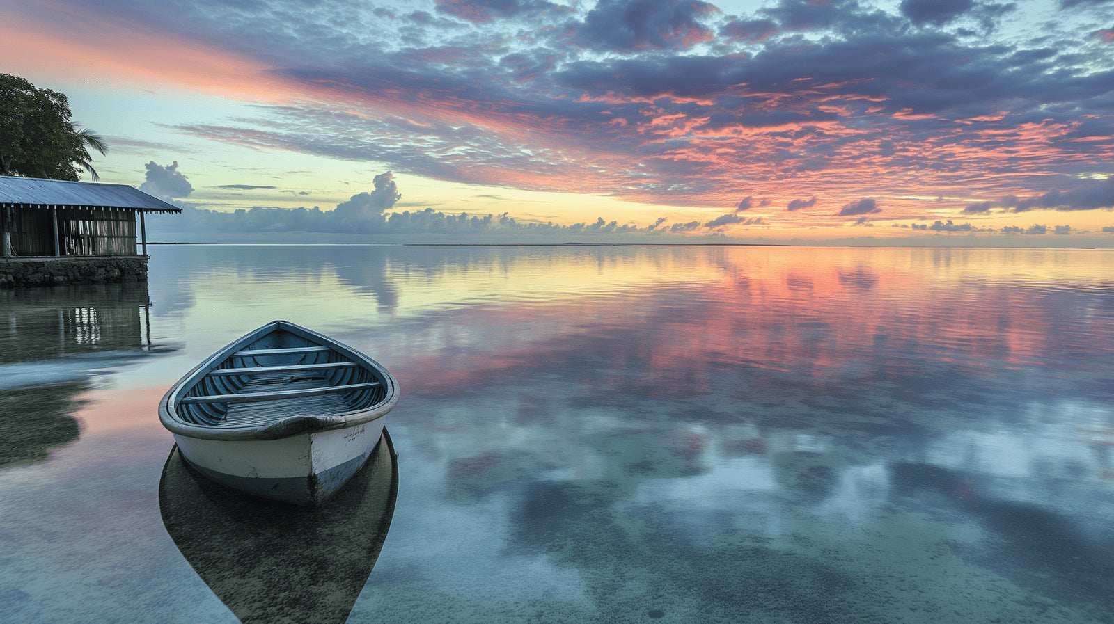 Diese Ozean-Sonnenuntergangs-Tapete fängt einen Moment reiner Gelassenheit ein, in dem Himmel und Meer in einer spektakulären Darstellung der Kunst der Natur aufeinandertreffen. Die dramatischen korallenrosa Wolken malen den Dämmerungshimmel und schaffen eine spiegelähnliche Reflexion auf den ruhigen Gewässern darunter. Ein Holzboot verankert die Szene, dessen verwitterter Rahmen einen schönen Kontrast zur Küstenlandschafts-Tapete bildet, während ätherische Pastelltöne von Gelb, Blau und Lila nahtlos über den Horizont verlaufen.