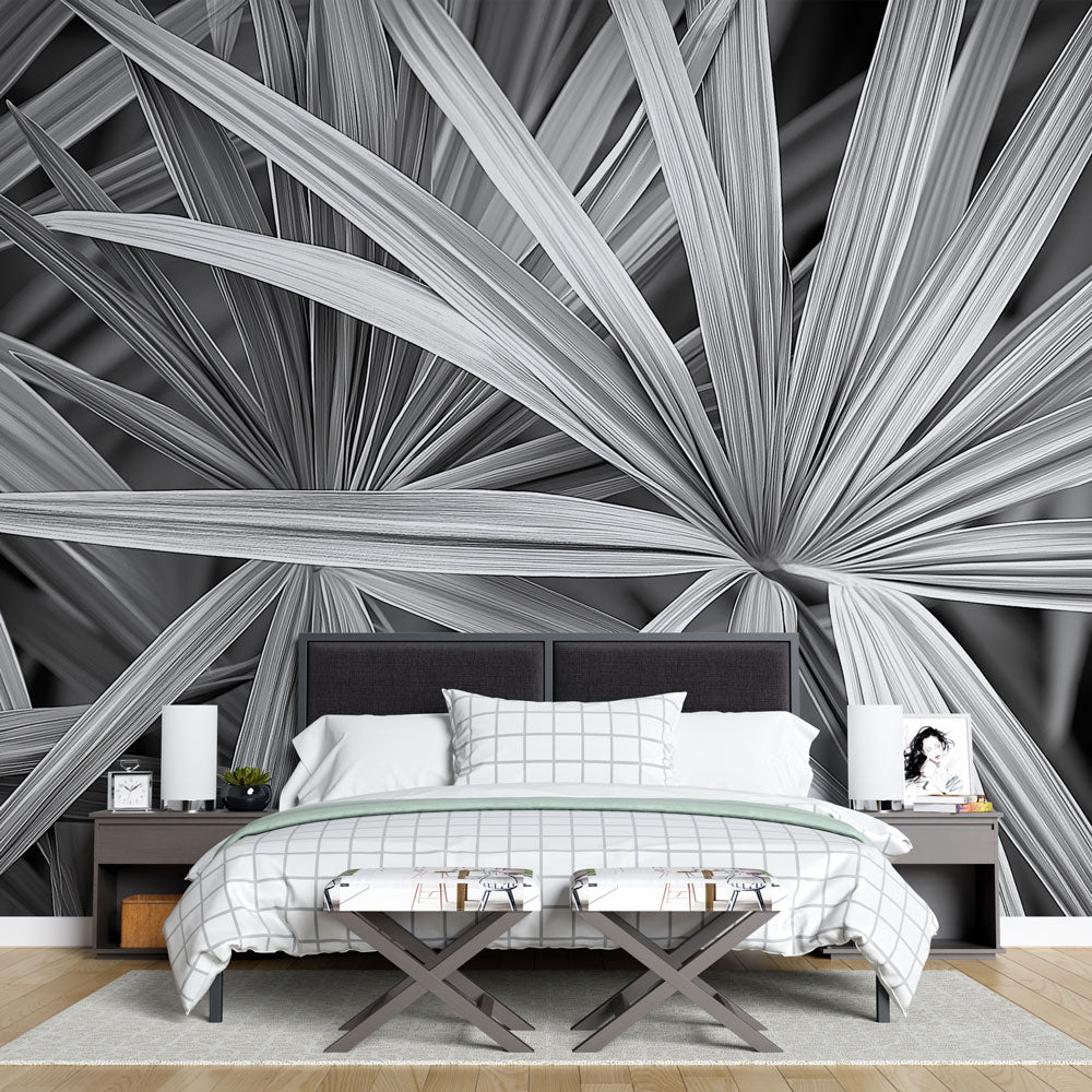 Diese schwarz-weiße Palmblatt-Tapete zeigt eine dramatische Nahaufnahme von Fächerpalmenblättern in auffälligen monochromen Details. Die anmutigen Kurven und linearen Muster der tropischen Blättertapete schaffen ein raffiniertes Spiel von Licht und Schatten, wobei jede Klinge feine Texturen und zarte Streifen vor dem tiefschwarzen Hintergrund zeigt. Das großformatige botanische Design bringt moderne architektonische Elemente in natürliche Formen und schafft eine kühne, aber dennoch elegante ästhetische Aussage.