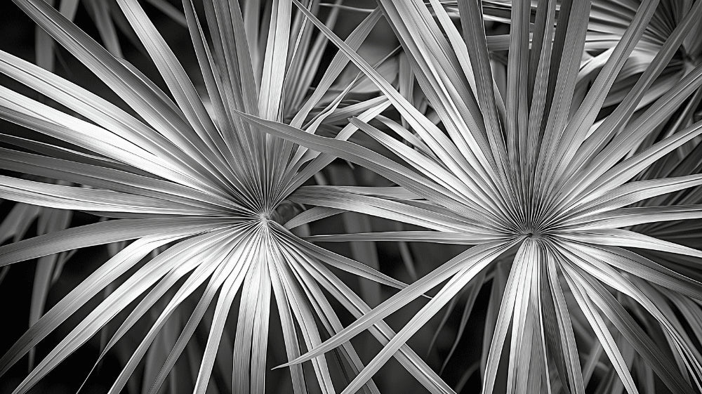 Diese schwarz-weiße Tapete mit Palmenblättern zeigt ein dramatisches botanisches Design, bei dem übergroße Fächerpalmenblätter ein faszinierendes geometrisches Muster bilden. Die monochromatische Farbpalette hebt jedes filigrane Detail der Blätter hervor, von ihren strahlenförmigen Linien bis zu ihren anmutig überlappenden Formen. Die tropische Blättertapete bringt durch ihre kontrastreiche Fotografie und künstlerische Komposition Tiefe und Raffinesse.