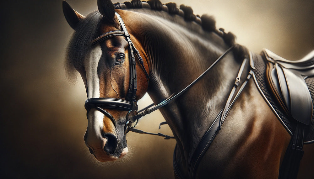 Dieses Reiter-Tapeten-Mural fängt die Essenz der Noblesse durch ein atemberaubendes Nahporträt eines prächtigen Braunen Pferdes ein. Die meisterhafte Fotografie zeigt die feinen Züge des Pferdes, von seinen ausdrucksvollen dunklen Augen bis zu seiner sorgfältig geflochtenen Mähne. Vor einem sanften Sepia-Hintergrund schaffen das reiche kastanienbraune Fell und das schwarze Lederzeug ein anspruchsvolles Zusammenspiel warmer Töne und tiefer Schatten, während das detaillierte Pferdeporträt bemerkenswerte künstlerische Präzision demonstriert.