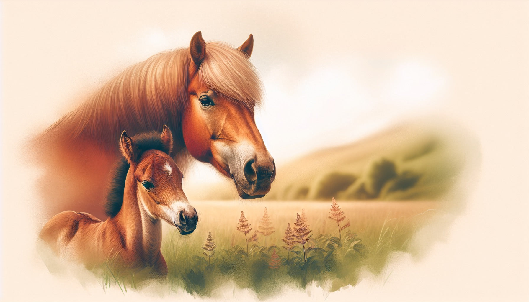 Diese Pferde-Tapete fängt einen zärtlichen Moment zwischen einer kastanienbraunen Stute und ihrem Fohlen vor einer ruhigen pastoralen Kulisse ein. Die detaillierte Kunstfertigkeit zeigt jede Nuance ihres seidigen Fells und ihrer ausdrucksvollen Augen, während die weichgezeichnete Wiesenlandschaft mit ihren goldenen Tönen und zarten Farnen Tiefe schafft. Die Reiter-Tapete demonstriert meisterhafte Liebe zum Detail, von den wehenden Mähnen bis zur sanften Interaktion zwischen Mutter und Kind.