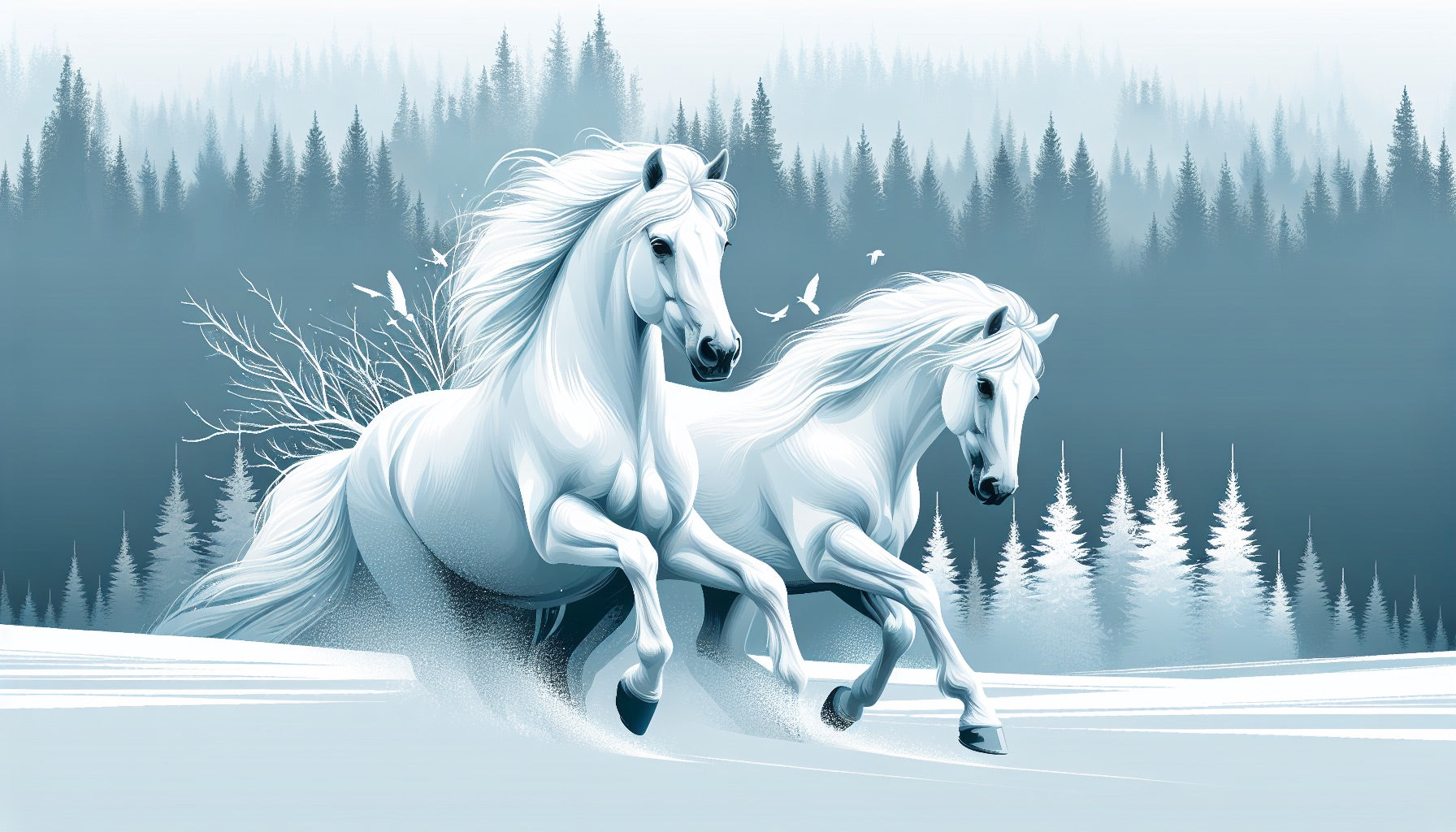 Diese weiße Pferdetapete fängt die majestätische Schönheit von zwei edlen Hengsten vor einer ruhigen Winterlandschaft ein. Die künstlerische Darstellung zeigt die kraftvolle Anmut der Pferde, von ihren wehenden Mähnen bis zu ihren muskulösen Formen, dargestellt in reinem Weiß vor kühlen Blau-Grau-Tönen. Die Waldtier-Tapete zeigt elegante Kiefern, die einen nebligen Hintergrund schaffen, während zarte Vögel im Flug Bewegung in diese ätherische Szene bringen.