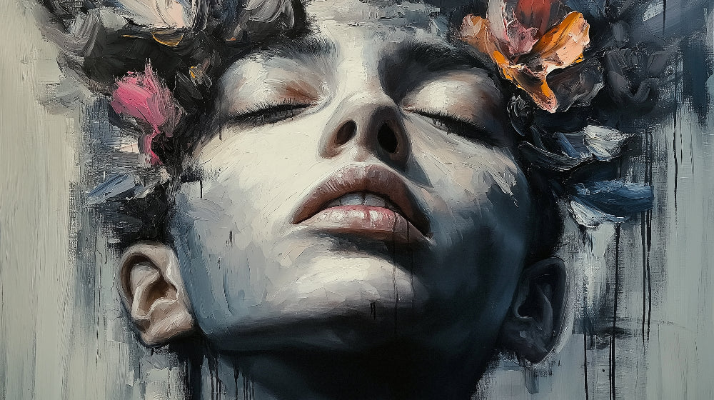 Diese abstrakte Porträt-Tapete fängt eine faszinierende künstlerische Vision ein, dargestellt in reichen, emotionalen Pinselstrichen. Die Komposition konzentriert sich auf ein nach oben gewandtes Gesicht in dramatischem Chiaroscuro, geschmückt mit zarten floralen Aquarellelementen in sanften Rosa- und warmen Orangetönen. Das Zusammenspiel von Licht und Schatten erzeugt einen auffälligen Kontrast zum stimmungsvollen, grau-blauen Hintergrund, während fließende malerische Texturen dieser zeitgenössischen Meisterwerk Tiefe und Bewegung verleihen.