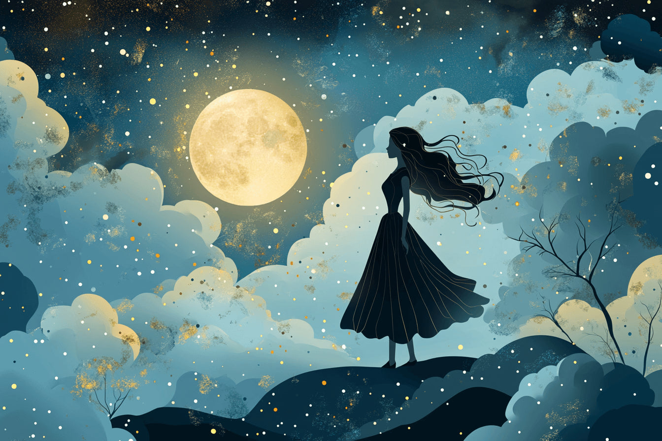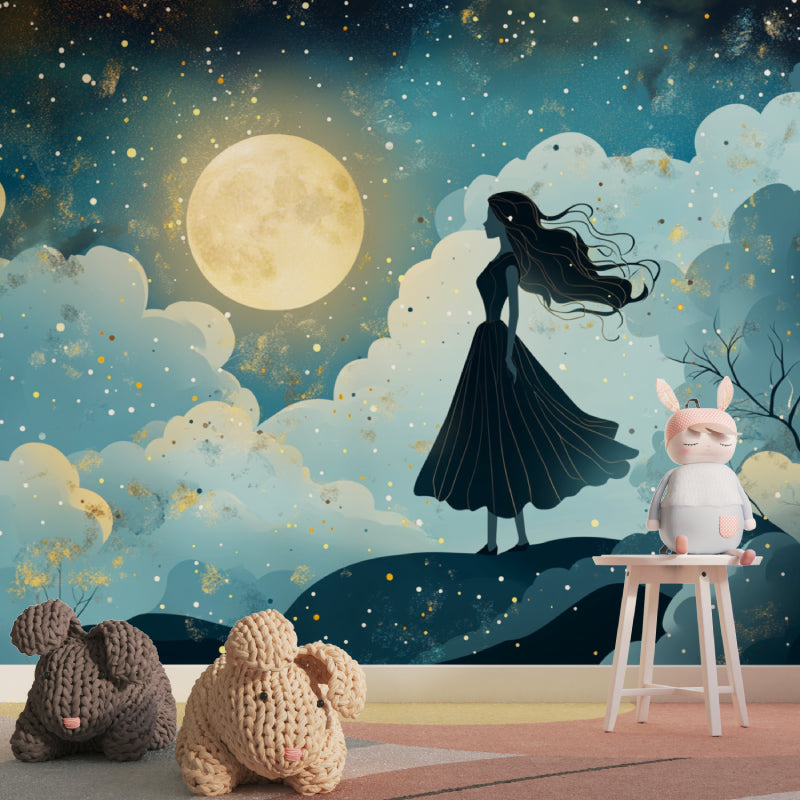 Dieses Prinzessinnen-Wandbild fängt eine bezaubernde nächtliche Szene ein, in der Eleganz auf Fantasie trifft. Eine anmutige Silhouette steht vor einem faszinierenden Hintergrund eines goldenen Vollmonds, umgeben von traumhaften, blau getönten Wolken und verstreuten goldenen Sternen. Die Art-Deco-Tapete verbindet anspruchsvolle Designelemente mit magischen Untertönen und schafft eine harmonische Mischung aus Geheimnis und Eleganz.