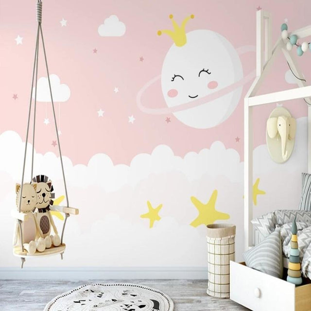 Diese bezaubernde Prinzessinnen-Tapete schafft mit ihrem verträumten rosa Hintergrund und verspielten Elementen eine magische himmlische Szene. Ein süßes Planetengesicht mit einer goldenen Krone steht im Mittelpunkt, umgeben von flauschigen weißen Wolken und funkelnden Sternen. Die zarte Farbpalette aus sanftem Rosa, reinem Weiß und sanften Gelbtönen schafft eine himmlische Kinderzimmer-Tapete, die Wärme und Charme ausstrahlt.