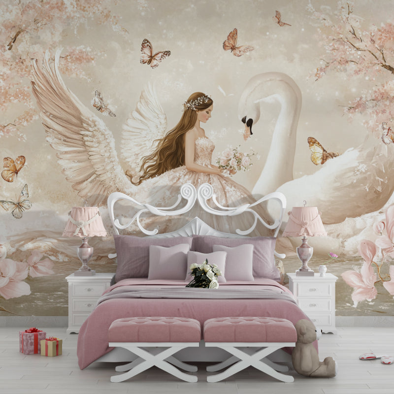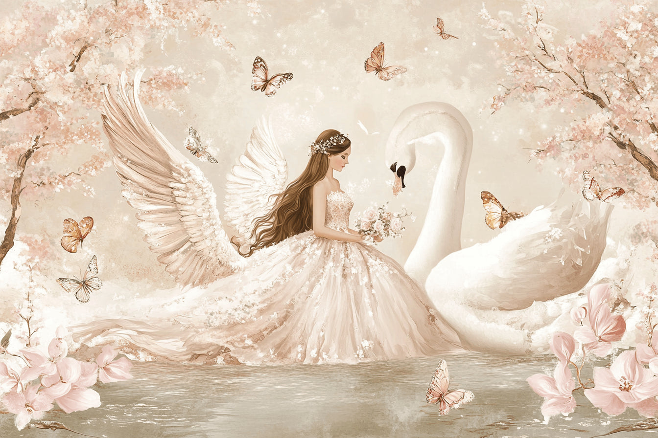 Diese Märchen-Tapete zeigt eine bezaubernde Szene, in der Fantasie auf Eleganz trifft. Das ätherische Design zeigt eine anmutige Gestalt mit zarten Flügeln, gekleidet in ein fließendes, roséfarbenes Kleid, die einen zärtlichen Moment mit einem majestätischen weißen Schwan teilt. Sanfte Schmetterlinge in weichen Kupfertönen tanzen durch die Komposition, während zarte Kirschblüten diese magische Prinzessinnen-Tapete in dezenten Rosatönen vor einem ruhigen beigen Hintergrund einrahmen.