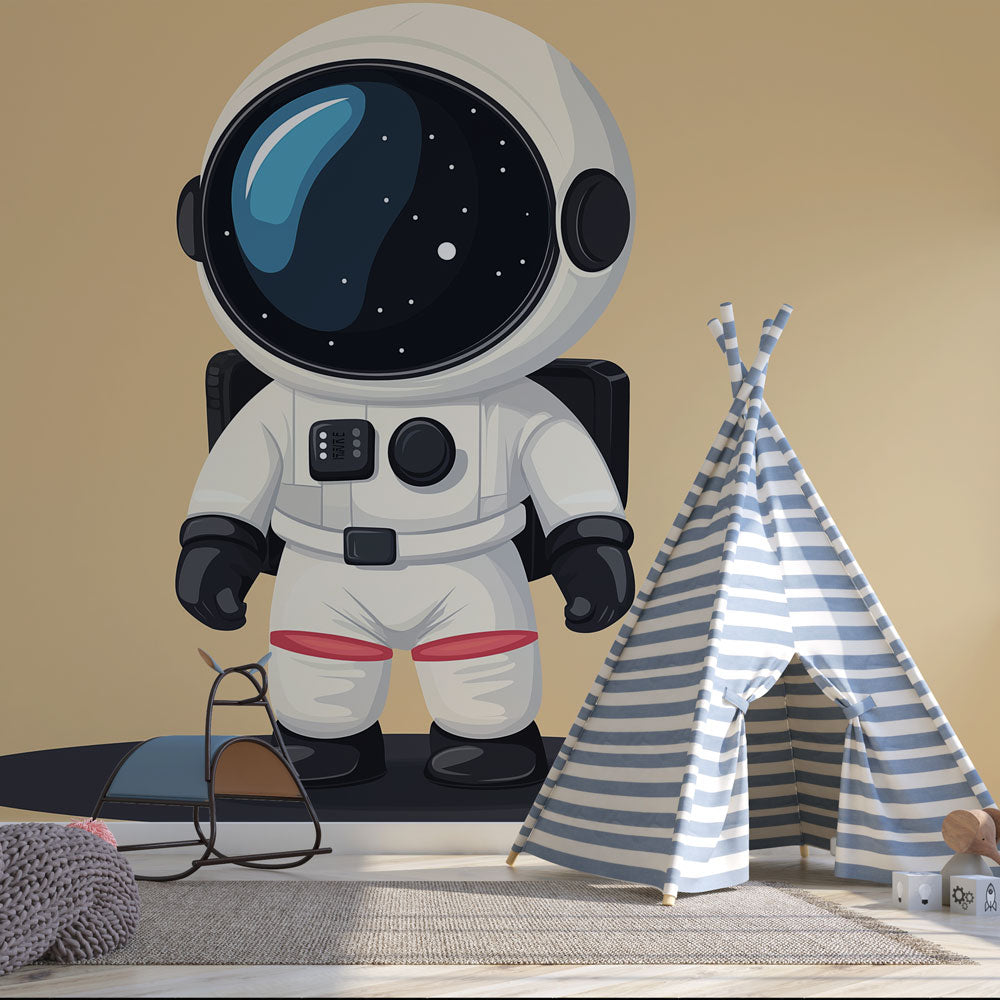 Diese Weltraum-Entdecker-Tapete zeigt eine charmante Astronautenfigur vor einem warmen, neutralen Hintergrund. Die detaillierte Illustration zeigt einen weiß gekleideten Raumfahrer mit einem markanten übergroßen Helm, komplett mit einem sternenbeleuchteten Visier, das die Tiefen des Weltraums reflektiert. Das Astronauten-Wandbild kombiniert klare Weißtöne, tiefes Schwarz und subtile Akzente in Blau und Rot und schafft so eine ausgewogene und visuell ansprechende Komposition, die das Wunder der Weltraumforschung einfängt.