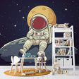 Diese bezaubernde Weltraum-Erkundungs-Tapete zeigt einen verspielten Astronauten, der auf der Mondoberfläche gegen einen tiefen marineblauen Kosmos sitzt. Die detaillierte Illustration zeigt einen dominanten goldenen Mondhintergrund, funkelnde Sterne und einen sorgfältig dargestellten Raumfahrer in klassischer weißer Anzugkleidung. Die Astronauten-Wandtapete verbindet spielerischen Charme mit astronomischer Genauigkeit und schafft eine kunstvolle Balance zwischen Fantasie und wissenschaftlicher Inspiration.