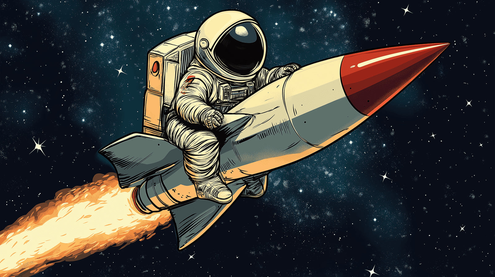 Dieses dynamische Weltraumabenteuer-Tapete zeigt eine kühne Retro-Illustration, in der ein Astronaut eine schlanke Rakete durch die kosmische Weite reitet. Das Design verfügt über einen vintage-inspirierten Raumanzug in Cremetönen, der einen schönen Kontrast zur rotspitzigen Rakete und dem tiefblau-schwarzen sternenklaren Hintergrund bildet. Die Astronauten-Tapete fängt das goldene Zeitalter der Weltraumforschung mit ihrem Comic-Stil und lebendigen Flammeneffekten ein.