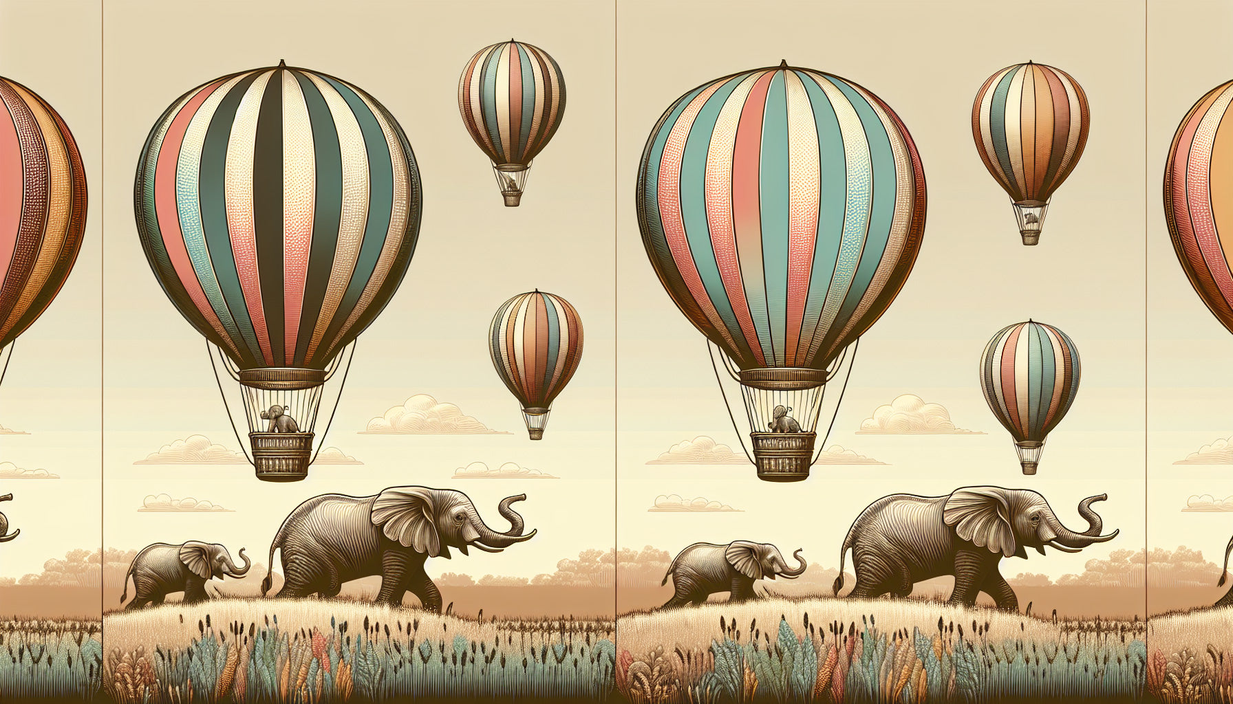 Diese bezaubernde Safari-Tapete fängt eine magische Szene ein, in der Heißluftballons im Vintage-Stil anmutig über eine ruhige afrikanische Landschaft schweben. Das Design zeigt majestätische Elefanten, die durch goldene Graslandschaften wandern, dargestellt in eleganten Sepia-Tönen. Die Ballons, geschmückt mit sanften Mintgrün-, Korallenrosa- und Cremestreifen, schaffen einen auffälligen Kontrast zum warmen beigen Himmel, während zarte Wolken und vielfältige Vegetation dieser Abenteuer-Tapete Tiefe verleihen.