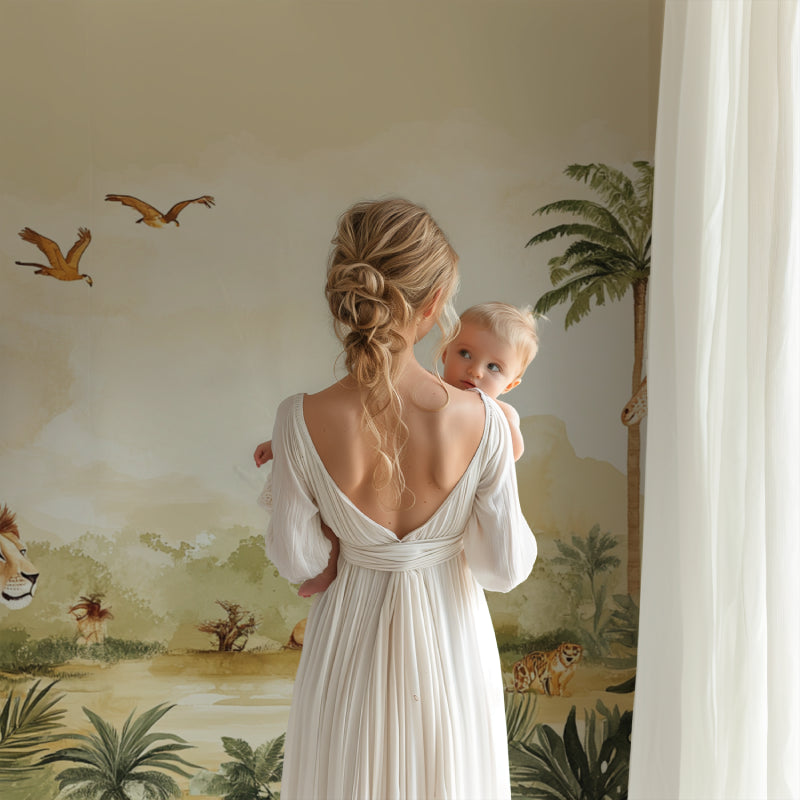 Dieses bezaubernde Safari-Tapeten-Mural bringt die Majestät der afrikanischen Tierwelt mit künstlerischer Finesse in Ihren Raum. Vor einem warmen, sandfarbenen Hintergrund schaffen majestätische Löwen, anmutige Giraffen und fliegende Vögel eine fesselnde Szene unter wiegenden Palmen. Die Dschungeltiere-Tapete zeichnet sich durch eine sanfte Aquarell-Ästhetik aus, die die wilde Savannenlandschaft mildert und gleichzeitig die natürliche Würde dieser bemerkenswerten Kreaturen bewahrt.