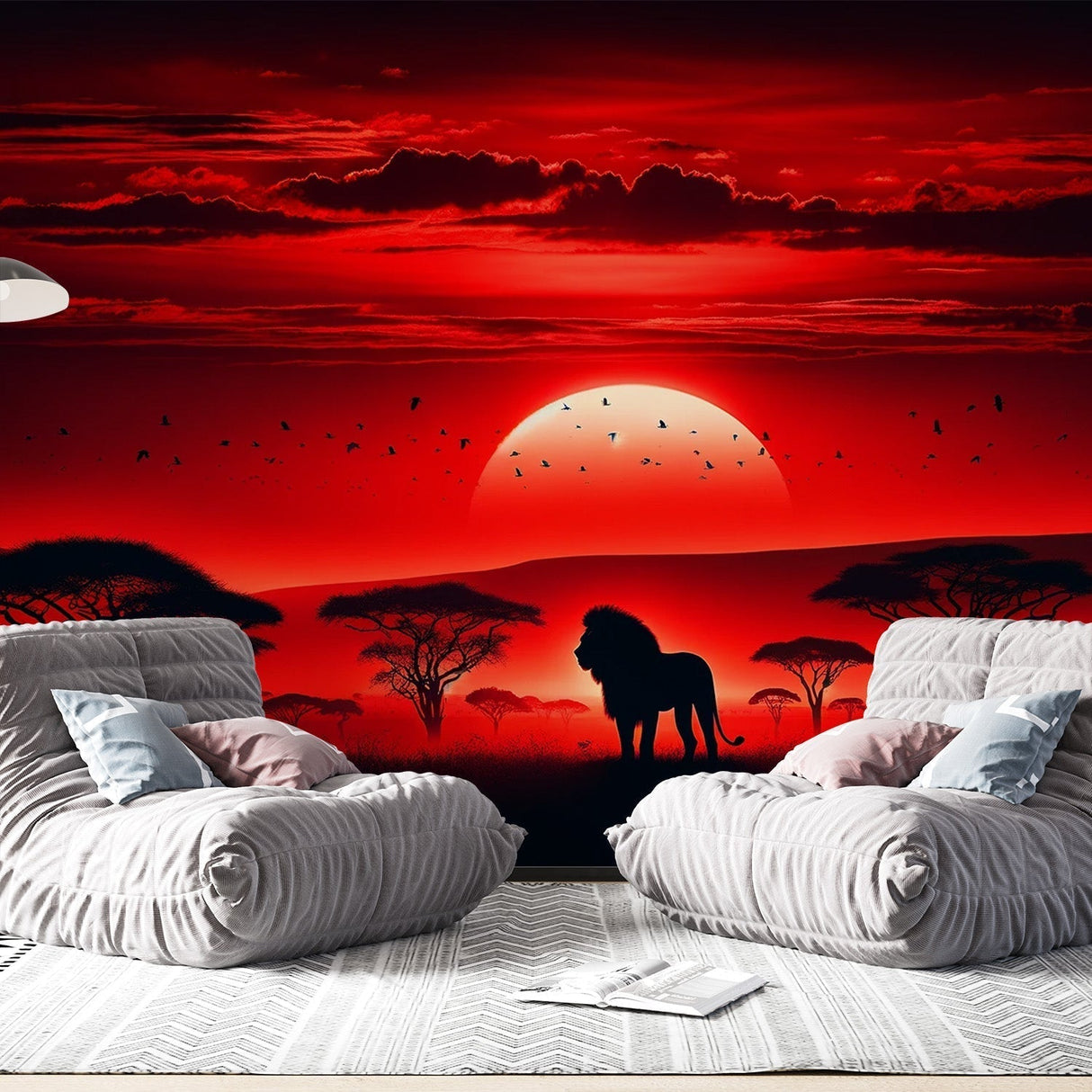 Verwandeln Sie Ihren Raum in ein beeindruckendes afrikanisches Heiligtum mit dieser Löwen-Sonnenuntergangs-Tapete. Die kraftvolle Komposition zieht den Blick auf sich und schafft bemerkenswerte Tiefe, wodurch jeder Raum größer und dynamischer wirkt. Dieses Safari-Wandbild-Design bringt die rohe Schönheit und den ungezähmten Geist der afrikanischen Wildnis in Ihr Interieur, ideal für alle, die eine mutige, von der Natur inspirierte Atmosphäre schaffen möchten, die Aufmerksamkeit erregt.