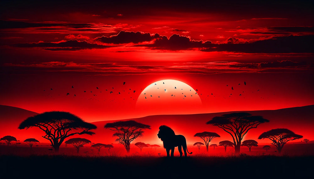 Diese afrikanische Savannen-Tapete fängt einen atemberaubenden Moment im Theater der Natur ein, in dem ein majestätischer Löwe vor einem dramatischen, purpurroten Sonnenuntergang silhouettiert steht. Der intensive rote Himmel taucht die Landschaft in warme, satte Töne, während verstreute Vögel über die glühende Sonne hinwegfliegen. Ikonische Akazienbäume säumen die afrikanische Safari-Landschaft, deren markante Formen eine perfekte Harmonie mit den sanften Savannenhügeln darunter schaffen.
