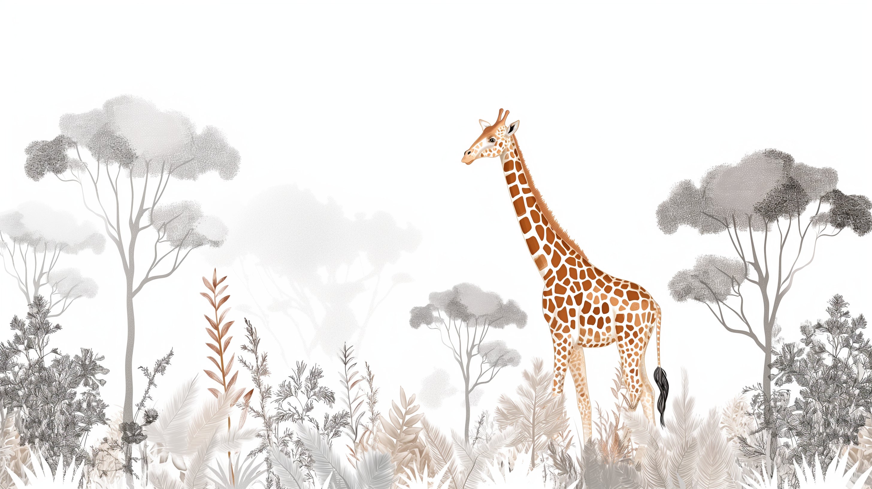 Verwandeln Sie Ihren Raum mit dieser Giraffen-Wandbildtapete, die die Lücke zwischen Natur und modernem Design überbrückt. Die sanfte Farbpalette aus Weiß-, Grau- und Erdtönen macht diese afrikanische Wildtier-Tapete vielseitig genug, um jeden Einrichtungsstil zu ergänzen, von zeitgenössisch bis traditionell. Ihre künstlerische Darstellung bringt die Ruhe der Savanne in Ihren Raum und bewahrt dabei eine Atmosphäre von Raffinesse.