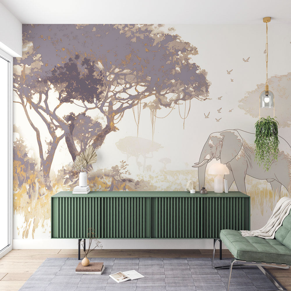 Diese afrikanische Savannen-Tapete fängt einen ruhigen Moment in der Natur mit meisterhafter Kunstfertigkeit ein. Majestätische Akazienbäume breiten ihre Kronen über einen nebligen Himmel aus, ihre Formen in raffinierten Grautönen und Lavendel dargestellt. Ein sanftes Elefanten-Tapetendesign entfaltet sich, während das prächtige Tier durch goldene Graslandschaften zieht, während zarte Vögel durch die ätherische Atmosphäre schweben und ein harmonisches Gleichgewicht zwischen Erde und Himmel schaffen.