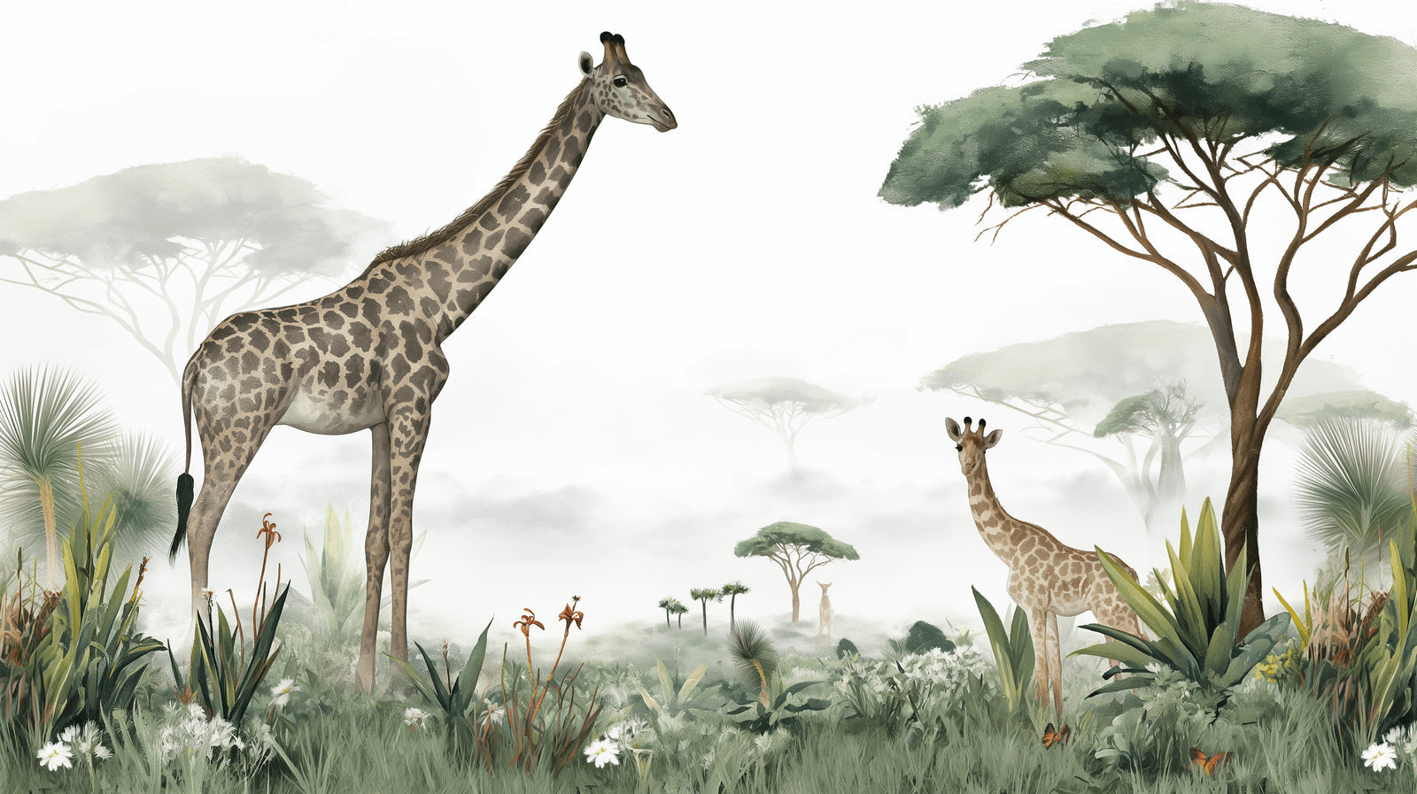 Verwandeln Sie jeden Raum in eine traumhafte afrikanische Landschaft mit diesem Giraffen-Mural-Tapete. Die sanfte, nebelgeküsste Atmosphäre und die gedämpfte grüne Farbpalette schaffen eine beruhigende Umgebung, die sowohl in Wohnräumen als auch in Kinderbereichen wunderbar wirkt. Diese afrikanische Safari-Tapete bringt die friedliche Großartigkeit der Tierwelt in Ihr Interieur und ist eine anspruchsvolle Wahl für alle, die eine Verbindung zur Natur schaffen möchten.
