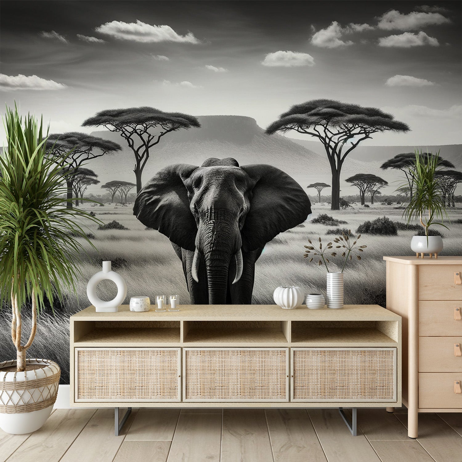 Safari Tapete | Schwarz-Weiß Elefantenlandschaft