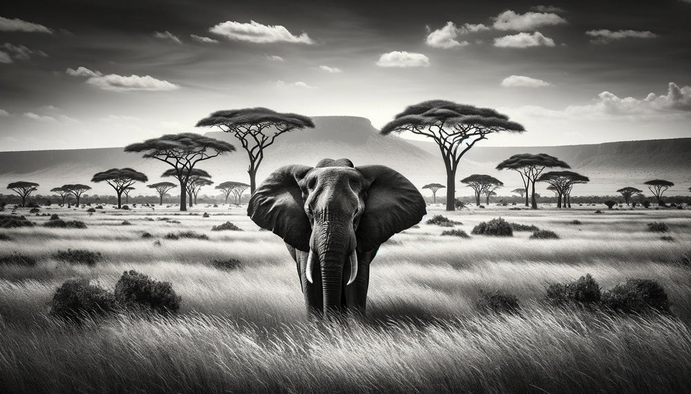 Diese afrikanische Safari-Tapete zeigt eine kraftvolle monochrome Komposition, die sich auf einen majestätischen Elefanten konzentriert, der zwischen den ikonischen Akazienbäumen der Savanne steht. Die Schwarz-Weiß-Fotografie fängt jedes feine Detail ein, von der strukturierten Elefantenhaut bis zu den vom Wind gepeitschten Graslandschaften, die sich zu entfernten Plateaus erstrecken. Die Elefanten-Wandbildtapete erzeugt ein dramatisches Spiel von Licht und Schatten, wobei aufgewölbte Wolken der weiten afrikanischen Himmelstiefe verleihen.