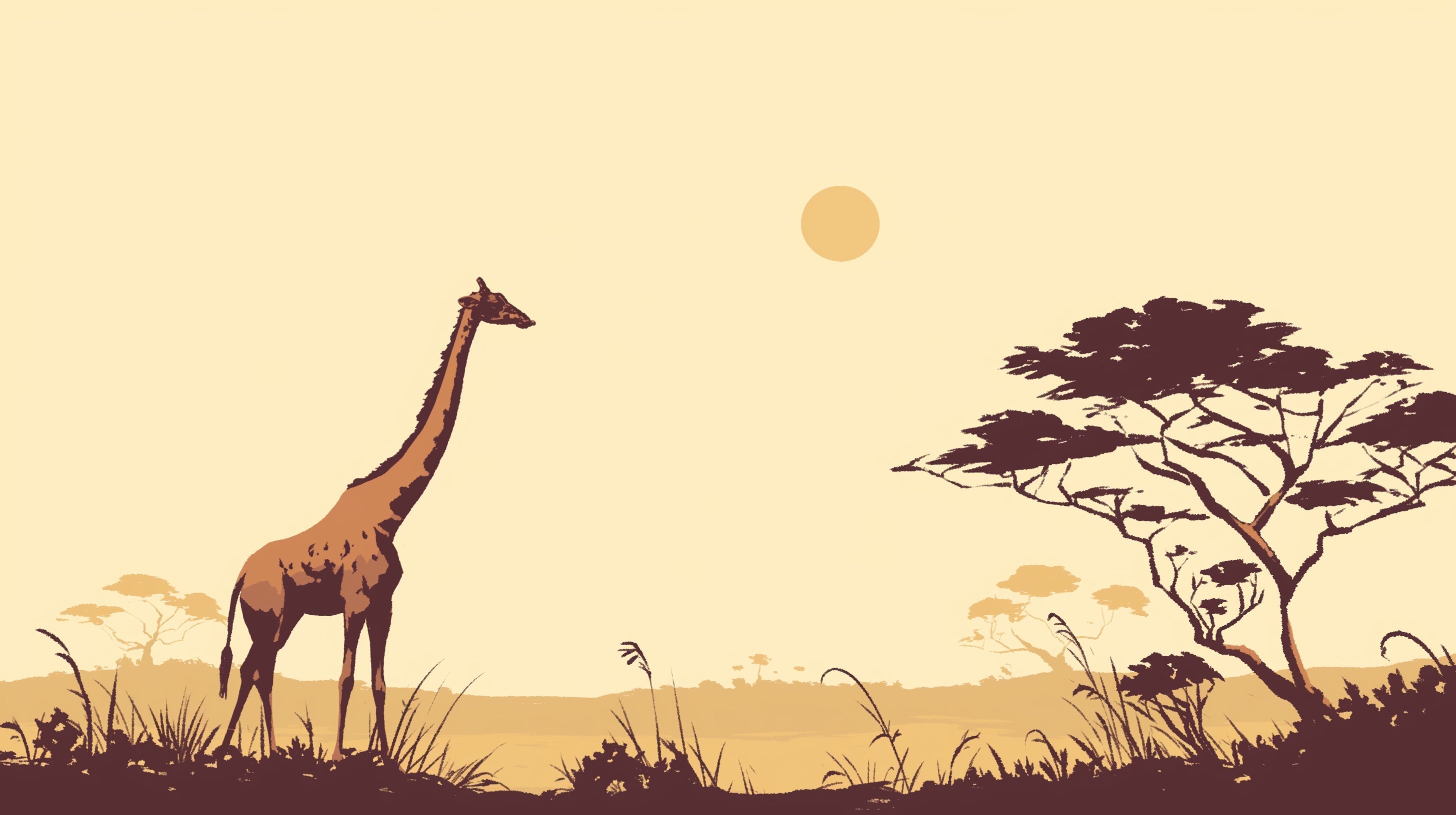 Diese afrikanische Safari-Tapete fängt die majestätische Schönheit einer einsamen Giraffe ein, die sich vor einem goldenen Sonnenuntergang in der Savanne abzeichnet. Der warme beige Himmel taucht die Szene in sanftes Licht, während die tiefbraunen Silhouetten von Akazienbäumen und hohem Gras einen auffälligen Kontrast schaffen. Das Giraffen-Wandbild zeigt die anmutigen Kurven des höchsten Tieres Afrikas, das stolz inmitten der Wildnislandschaft steht.