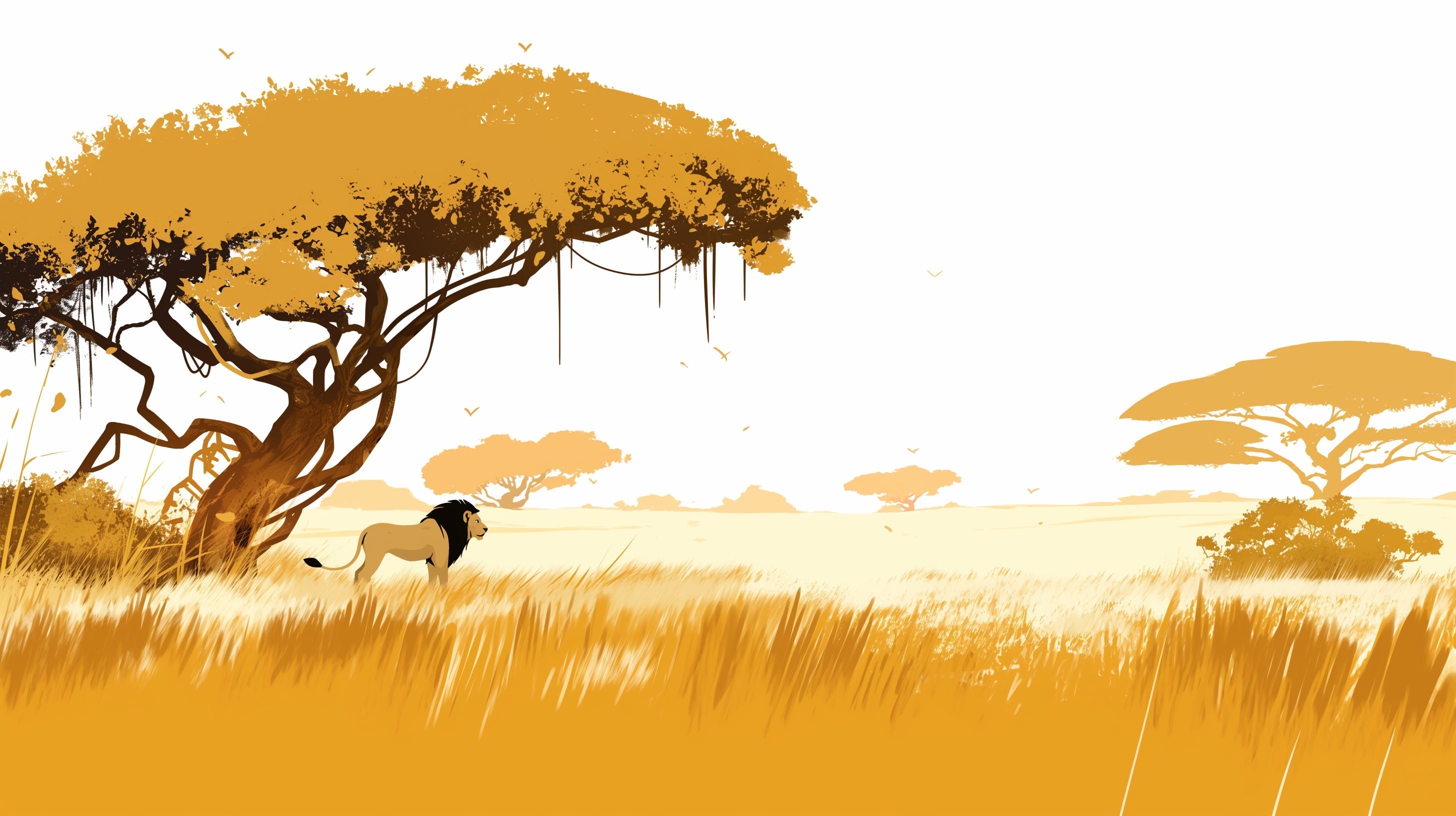 Diese afrikanische Safari-Tapete fängt den ungezähmten Geist der Savanne in einer meisterhaften Mischung aus warmen goldenen Farbtönen und künstlerischer Schlichtheit ein. Der majestätische Löwe steht unter einem hoch aufragenden Akazienbaum, dessen markante Silhouette vor einem Hintergrund sonnenverwöhnter Graslandschaften zu sehen ist. Die Savannenlandschafts-Tapete zeigt zarte Details im wiegenden Gras, verstreute Vögel im Flug und die ikonischen schirmförmigen Bäume, die den Horizont säumen.