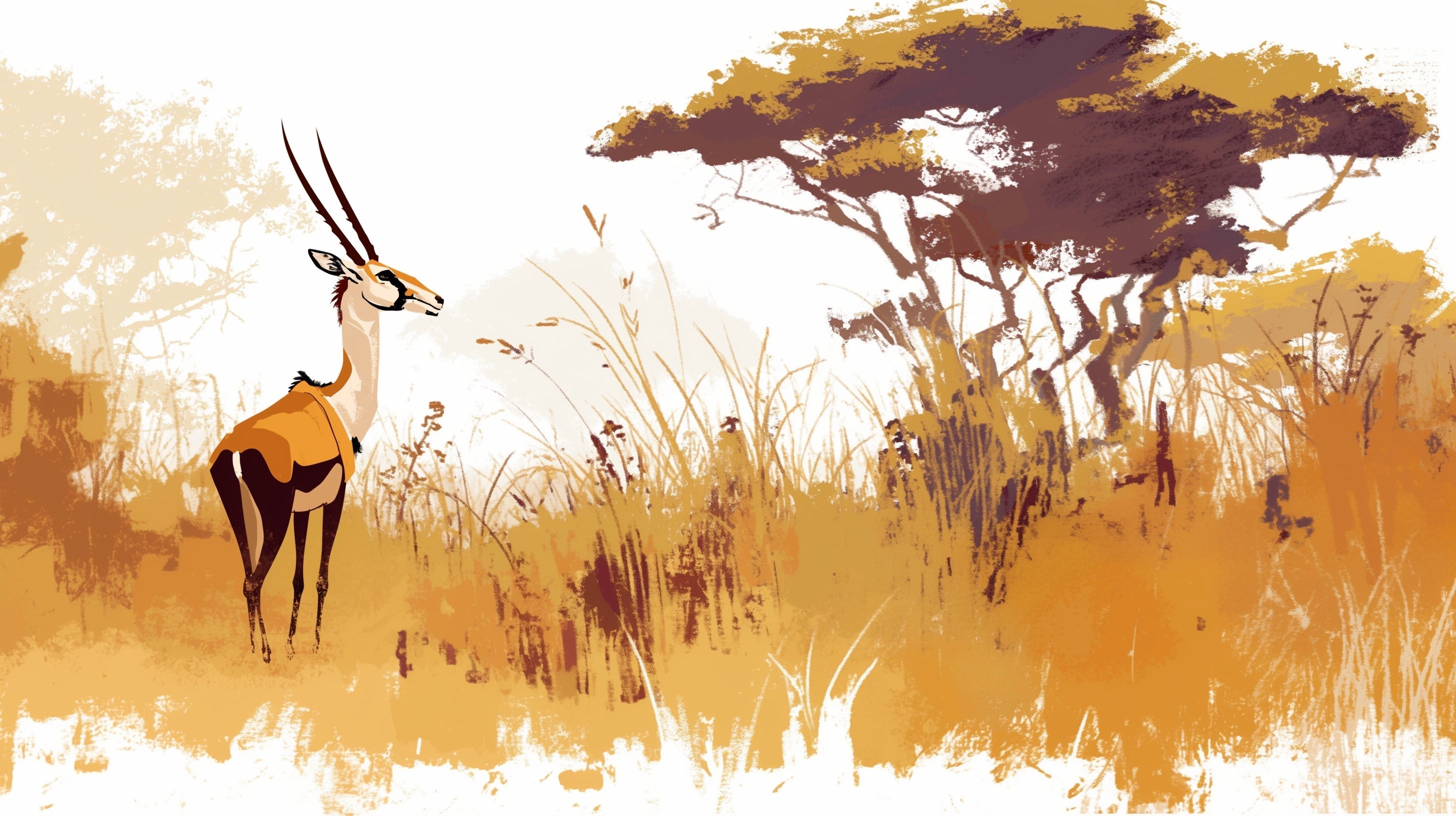Diese afrikanische Savannen-Tapete fängt die Essenz wilder Schönheit mit ihrer künstlerischen Darstellung einer majestätischen Gazelle ein, die zwischen sonnenverwöhnten Graslandschaften steht. Die Komposition verbindet meisterhaft warme goldene Töne mit tiefen Burgundakzenten, während die anmutige Antilope aufmerksam vor einem Hintergrund einheimischer Akazienbäume steht. Die Safari-Tapete zeigt zarte Details in den wiegenden Gräsern und der atmosphärischen nebligen Ferne und schafft eine anspruchsvolle Tiefenschärfe.