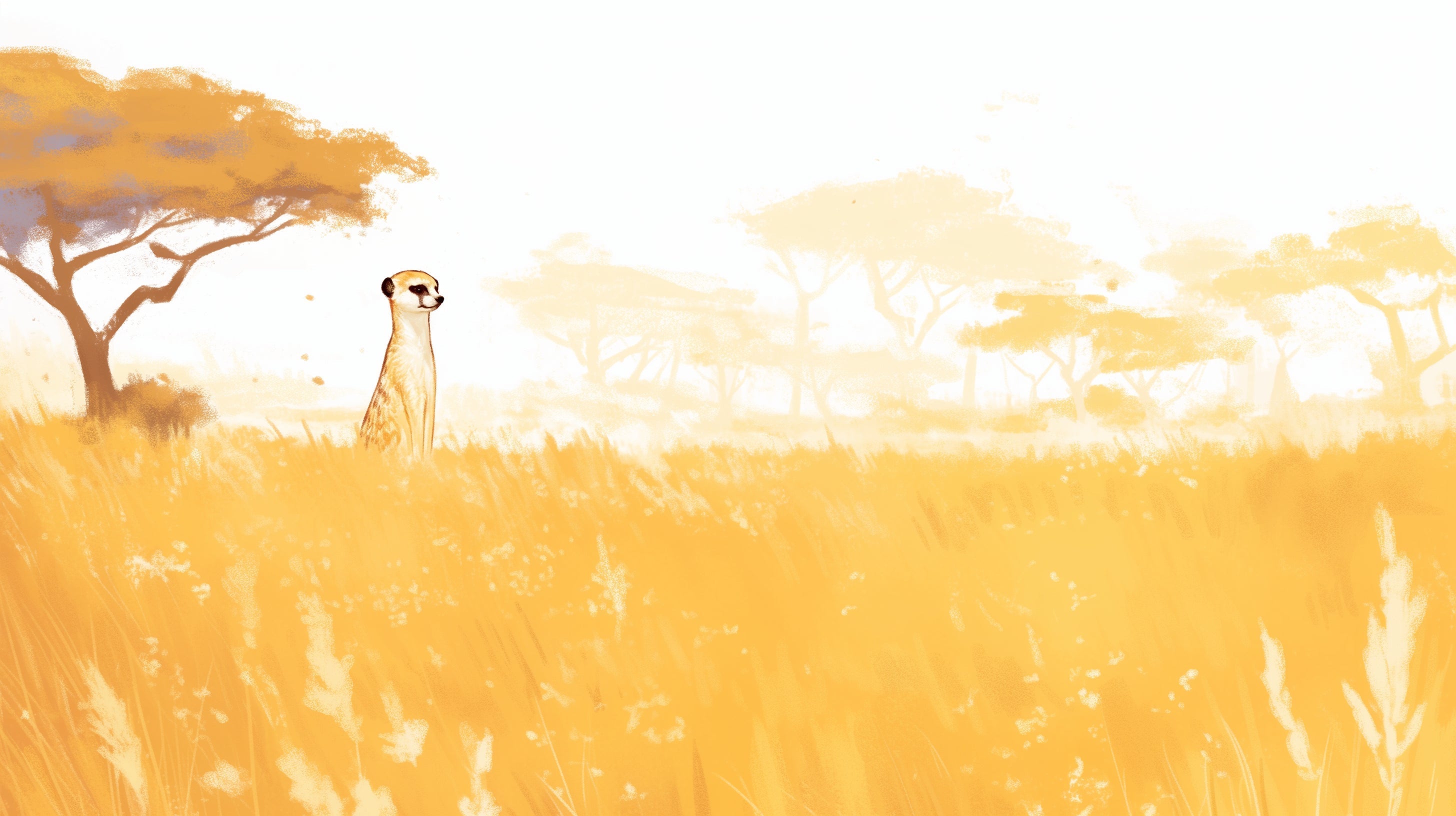 Diese afrikanische Savannen-Tapete fängt die Essenz der Wildnis mit ihrer künstlerischen Darstellung eines wachsamen Erdmännchens ein, das in sonnenverwöhnten Graslandschaften Wache hält. Die Komposition entfaltet sich in warmen goldenen Tönen, mit anmutigen Akazienbäumen, die sich gegen einen nebligen Horizont abzeichnen. Die Safari-Tapete zeigt zarte Pinselstriche, die das wiegende Savannengras zum Leben erwecken und eine verträumte, atmosphärische Szene schaffen, die Ruhe und natürliche Schönheit ausstrahlt.