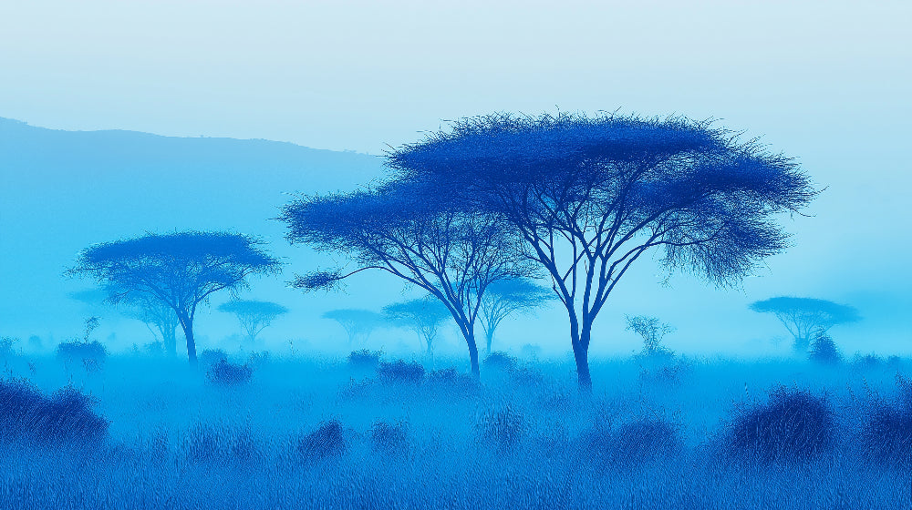 Diese afrikanische Savannen-Tapete fängt die mystische Essenz der Morgendämmerung auf den Ebenen ein, wo majestätische Akazienbäume durch einen ätherischen blauen Nebel auftauchen. Die Silhouetten dieser ikonischen Savannenbäume stehen wie Wächter gegen den ruhigen Himmel, ihre ausladenden Kronen schaffen ein bezauberndes Spiel von Licht und Schatten. Jeder Ast und zarter Zweig ist in tiefen Indigo-Tönen dargestellt, die einen schönen Kontrast zum sanften azurblauen Hintergrund bilden.