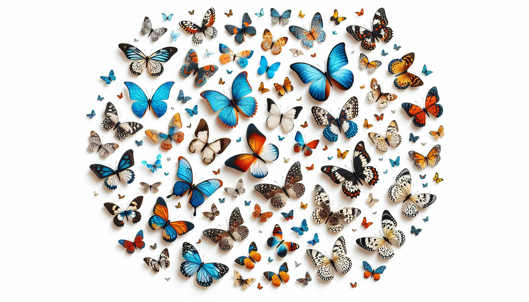 Dieses Schmetterlings-Wandbild schafft eine faszinierende Darstellung der elegantesten Geschöpfe der Natur im Flug. Mit einer atemberaubenden Auswahl an blauen Morpho-Schmetterlingen neben orangefarbenen Monarchen und zarten weißen Exemplaren zeigt dieses Design filigrane Flügelmuster, die scheinbar anmutig vor dem klaren weißen Hintergrund schweben. Die 3D-Schmetterlings-Tapete präsentiert eine meisterhafte Komposition, bei der jeder Schmetterling subtile Schatten zu werfen scheint, was ein außergewöhnliches Gefühl von Tiefe und Bewegung erzeugt.