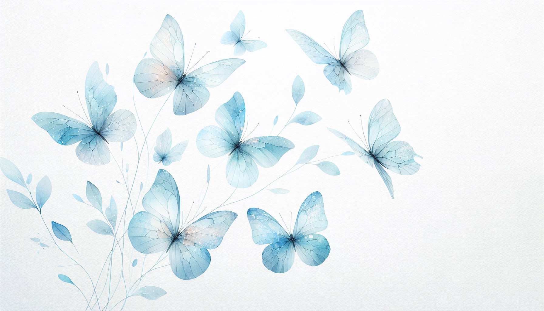 Diese Schmetterlings-Tapete zeigt eine ätherische Sammlung zarter blauer Schmetterlinge, die anmutig vor einem makellosen weißen Hintergrund schweben. Jeder Flügel ist in durchscheinenden Aquarelltechniken dargestellt, die einen Farbverlauf von puderblau bis zu tieferen Azurtönen erzeugen. Sanfte botanische Elemente und Blattmotive ergänzen das blaue Schmetterlingsdesign und fügen der Komposition subtile Bewegung und organischen Fluss hinzu.