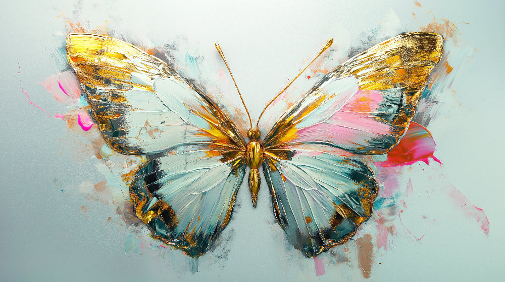 Diese künstlerische Schmetterlings-Tapete zeigt einen majestätischen Lepidopteren, dargestellt im auffälligen Aquarellstil. Der zentrale Schmetterling zieht mit seinen goldumrandeten Flügeln, die vor einem sanften türkisfarbenen Hintergrund schimmern, alle Blicke auf sich. Zarte Pinselstriche verbinden Weiß-, Gold- und Azurtöne, während subtile rosa Akzente eine ätherische Atmosphäre schaffen. Das moderne Schmetterlings-Mural zeigt expressive Farbspritzer, die Bewegung und künstlerischen Flair in das Design bringen.