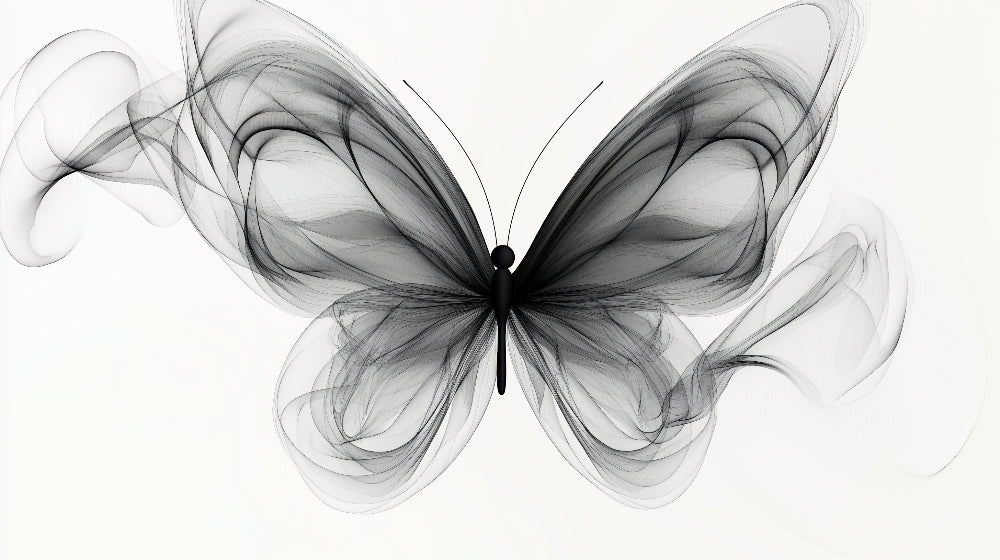 Diese schwarze Schmetterlings-Tapete zeigt ein ätherisches Design, bei dem rauchige Schwaden schwarzer Tinte tanzen, um ein faszinierendes geflügeltes Meisterwerk zu formen. Die anmutigen Kurven und durchscheinenden Schichten schaffen ein raffiniertes Spiel von Licht und Schatten, während die minimalistische Schwarz-Weiß-Palette ein auffälliges modernes Schmetterlings-Wandbild liefert, das scheinbar schwerelos vor seinem makellosen weißen Hintergrund schwebt.