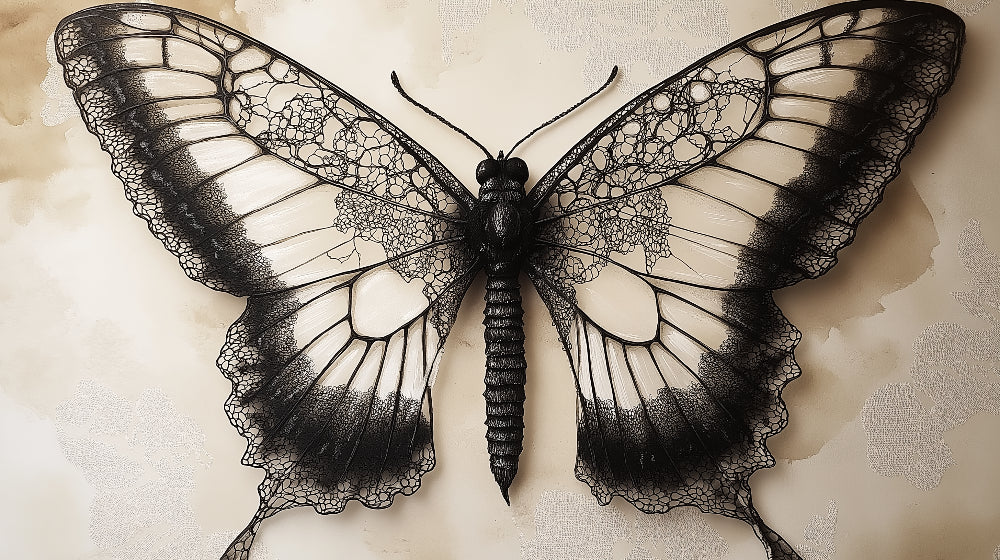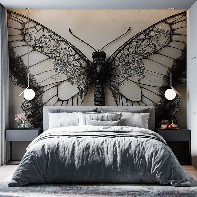 Diese auffällige schwarze Schmetterlings-Tapete zeigt ein außergewöhnliches großformatiges Design, bei dem filigrane spitzenartige Muster zarte Flügelstrukturen bilden. Die monochromatische Farbpalette schafft ein raffiniertes Spiel von Licht und Schatten, mit detaillierten geometrischen Zellen und Adern, die die natürliche Schönheit von Schmetterlingsflügeln einfangen. Das moderne Schmetterlings-Mural hebt sich vor einem sanften beigen Hintergrund ab und schafft einen dramatischen, aber eleganten Blickfang.