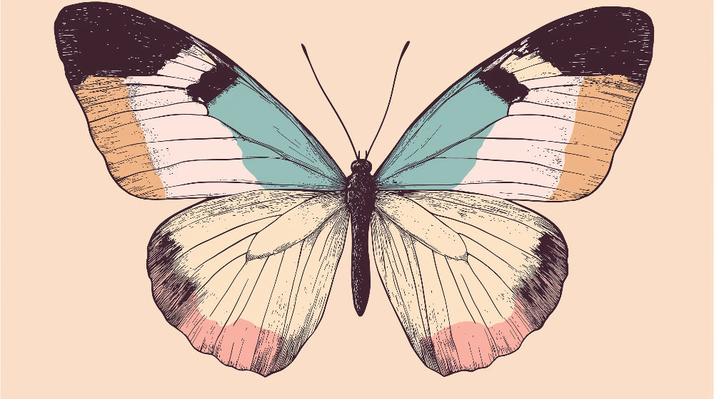 Dieses Schmetterlings-Tapeten-Mural zeigt eine elegante, übergroße Illustration, die in einer raffinierten Pastellpalette gestaltet ist. Das zarte Flügeldesign weist sanfte Türkis-, Beige- und Blassrosa-Töne auf, kunstvoll ausbalanciert mit kräftigen schwarzen Linien in einem vintage-inspirierten Stil. Das großformatige Schmetterlingsdesign zeigt akribische Detailgenauigkeit, von den anmutigen Flügelmustern bis zur subtilen Texturierung, die der Illustration ihren unverwechselbaren künstlerischen Charakter verleiht.