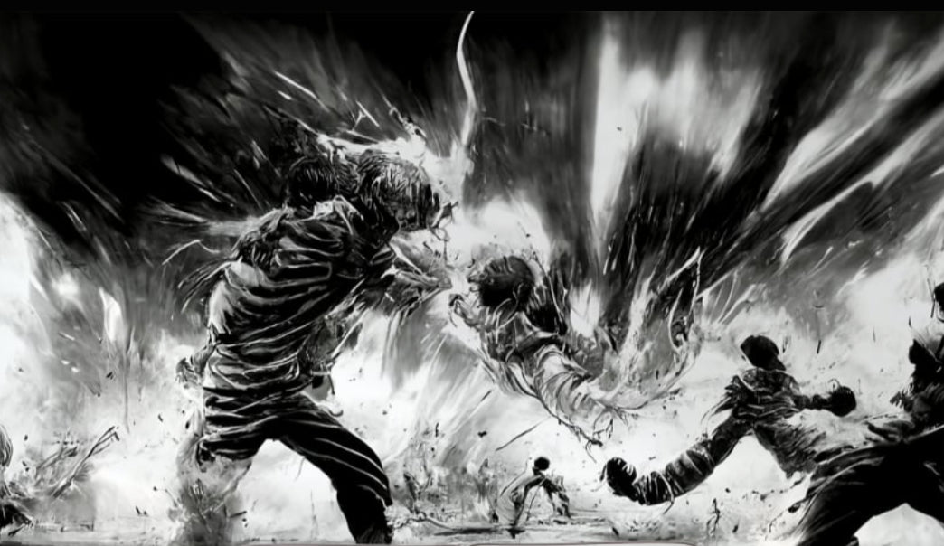 Diese schwarz-weiße Kunsttapete fängt einen explosiven Moment roher Energie und dynamischer Bewegung ein. Die dramatische monochrome Komposition zeigt silhouettierte Figuren, die in einem intensiven künstlerischen Tanz gefangen sind, mit kraftvollen Pinselstrichen und Spritzern, die eine Atmosphäre kontrollierten Chaos schaffen. Die monochrome Wandtapete demonstriert meisterhaften Kontrast zwischen tiefem Schwarz und strahlendem Weiß und bildet eine auffällige visuelle Erzählung, die Aufmerksamkeit verlangt.