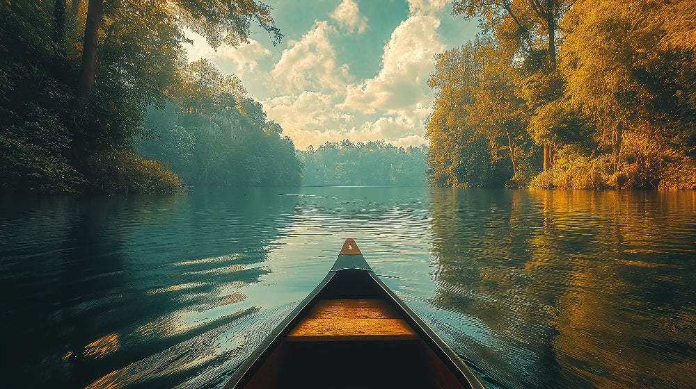 Diese ruhige See-Tapete fängt eine faszinierende Szene ein, in der smaragdgrünes Wasser die goldlaubigen Bäume entlang ihrer Ufer spiegelt. Die Komposition zieht Sie auf eine friedliche Reise, wobei der Bug eines Holzkanus die stillen Gewässer unter einem türkisfarbenen Himmel durchbricht, der mit baumwollweißen Wolken übersät ist. Das Waldsee-Wandbild zeigt die Kunst der Natur durch das Zusammenspiel von warmem bernsteinfarbenem Laub und kühlen türkisgrünen Wassern und schafft so ein harmonisches Gleichgewicht von Farben und Spiegelungen.